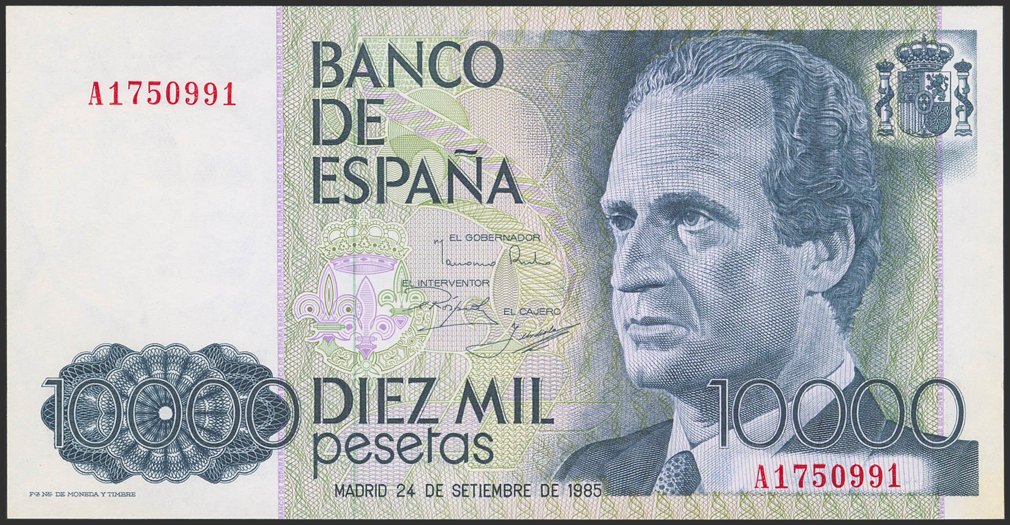 10,000 Pesetas. September 24, 1985. Series A. (Edifil 2023: 481). Uncirculated-.