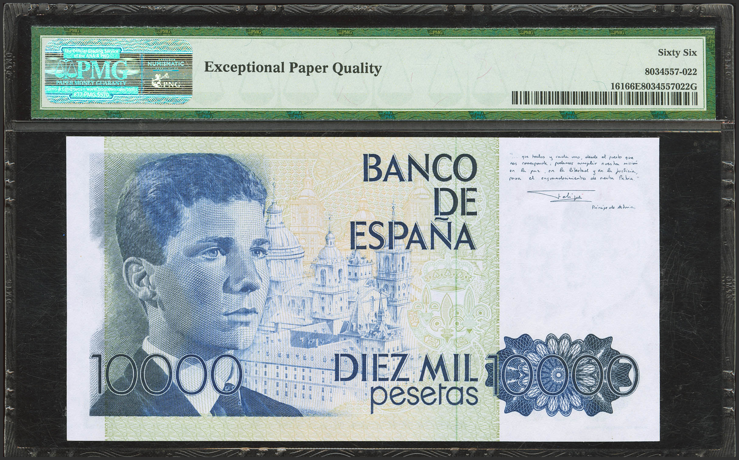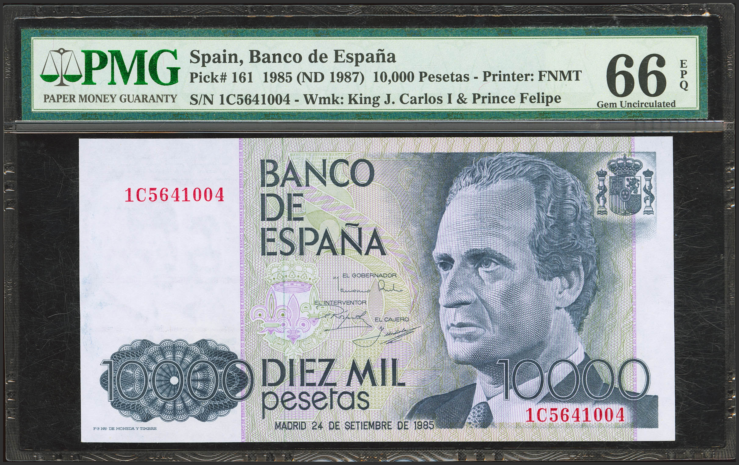 English 10,000 Pesetas. September 24, 1985. Series 1C. (Edifil 2023: 481a, Pick: 161). Uncirculated. PMG66EPQ package.