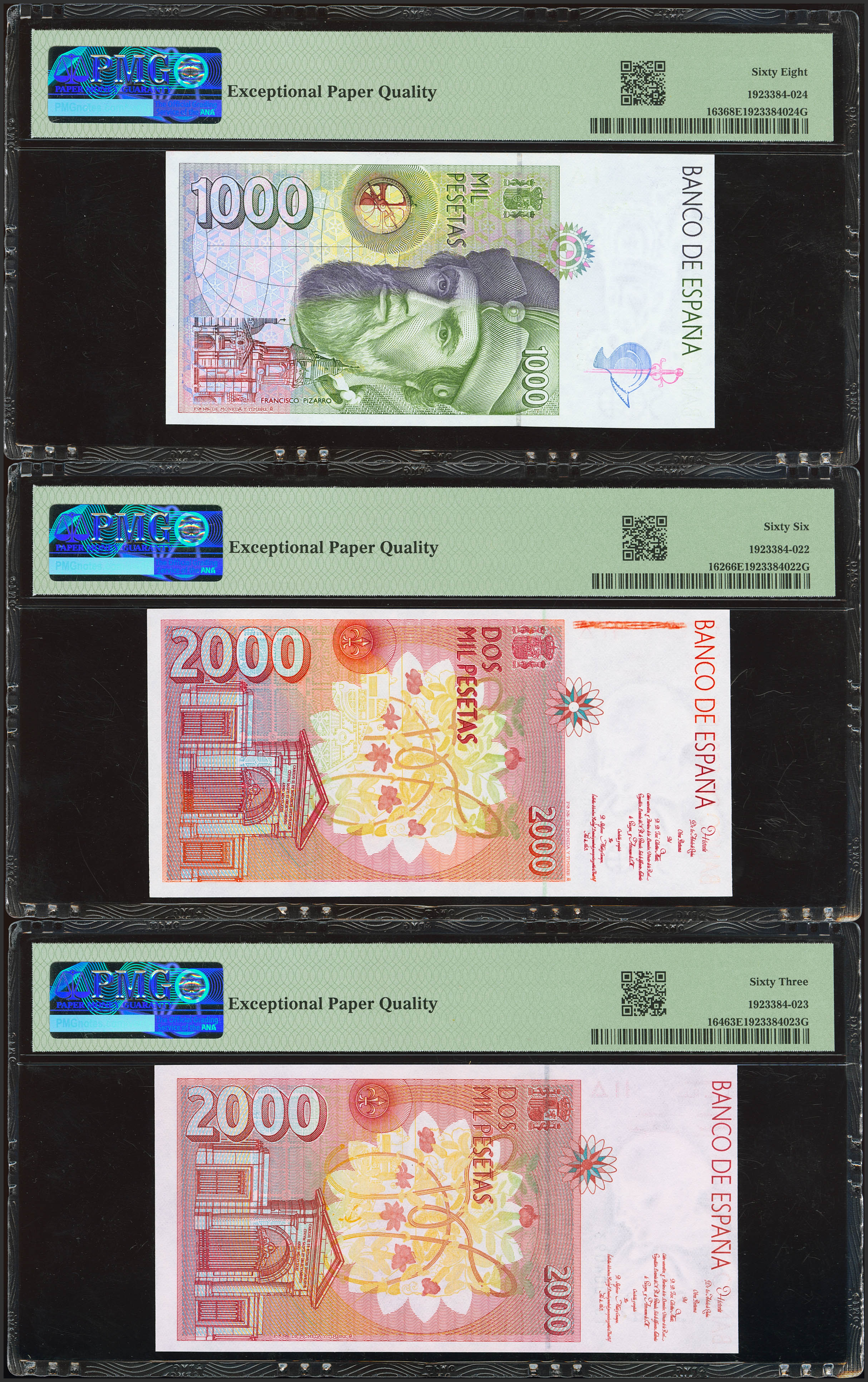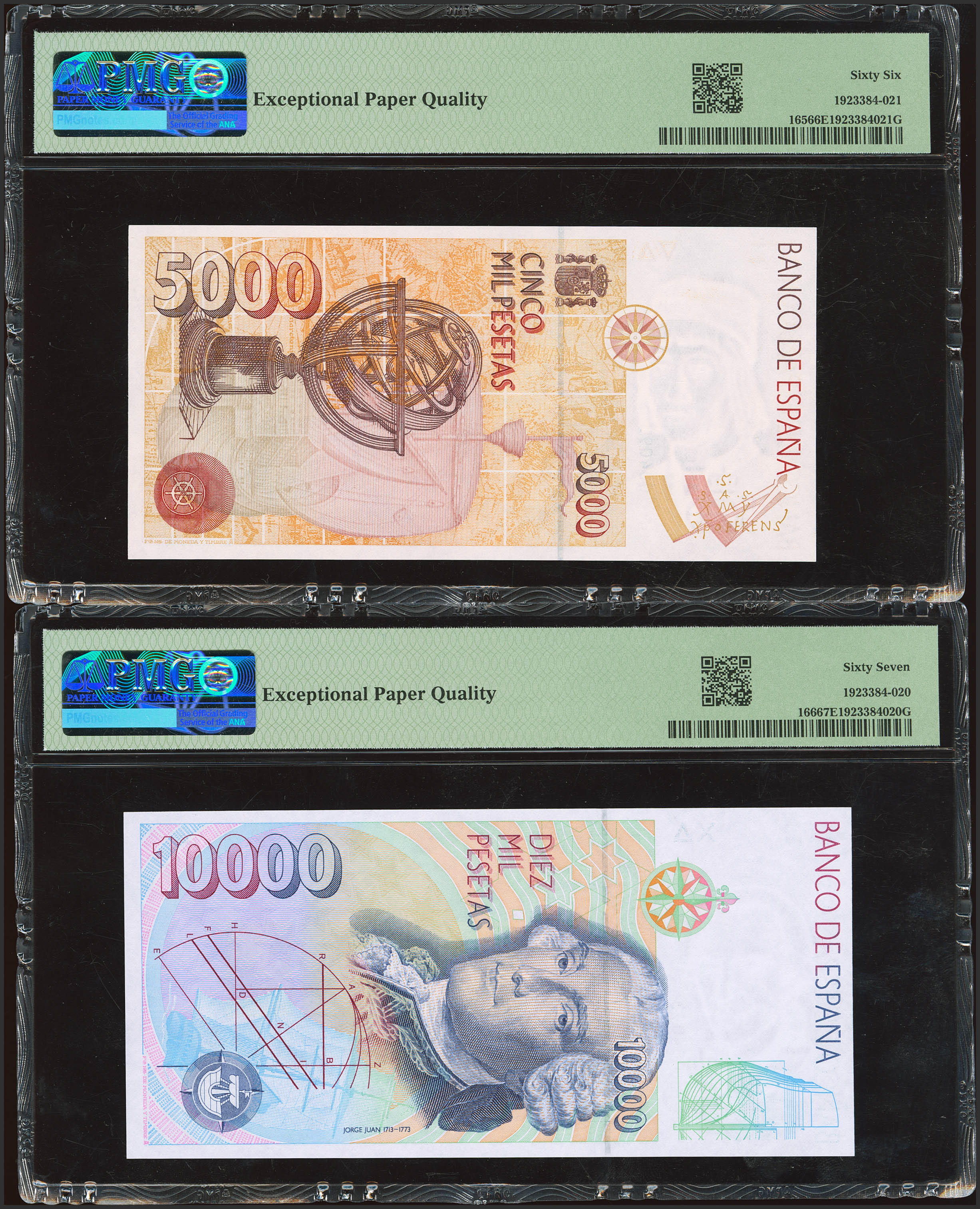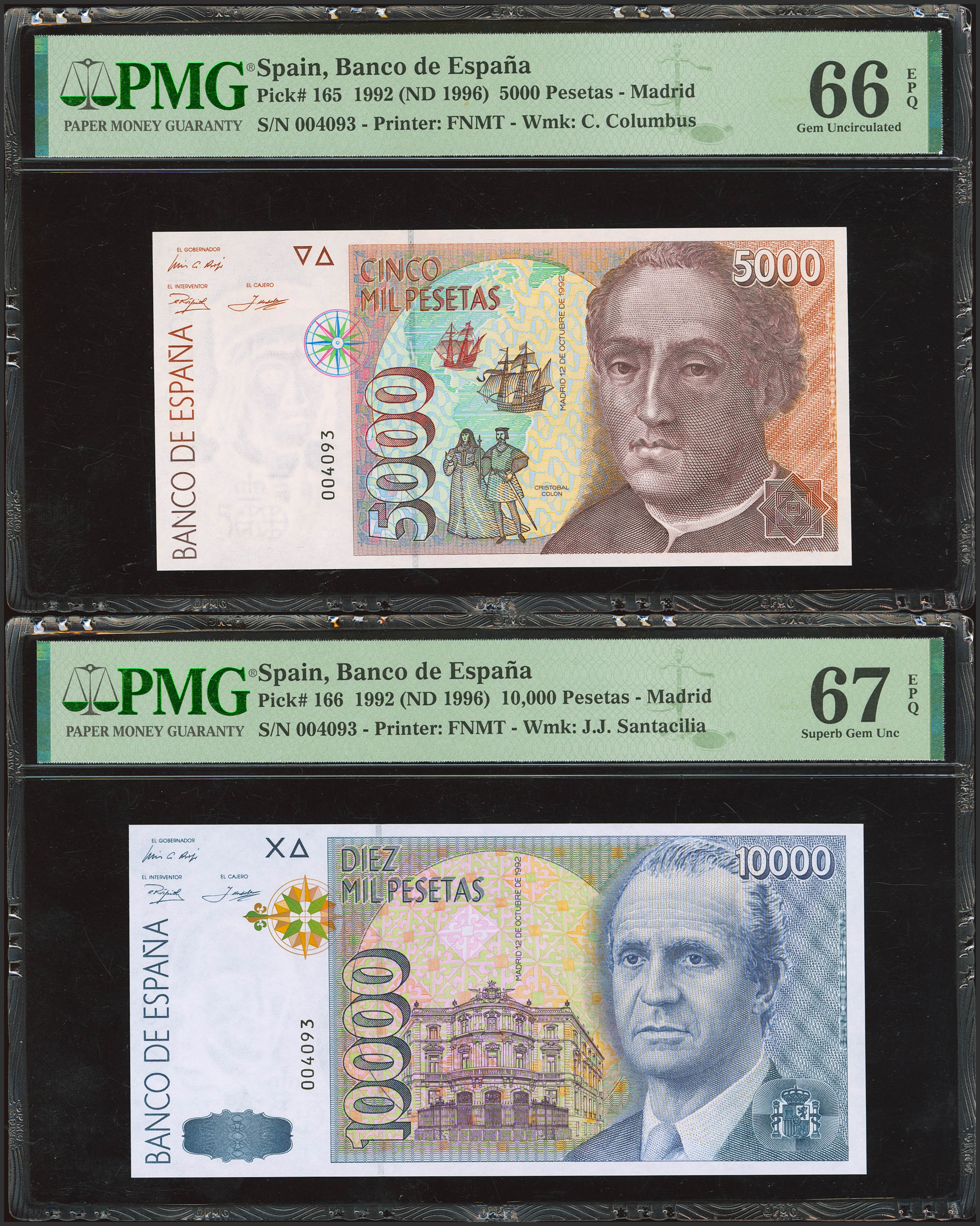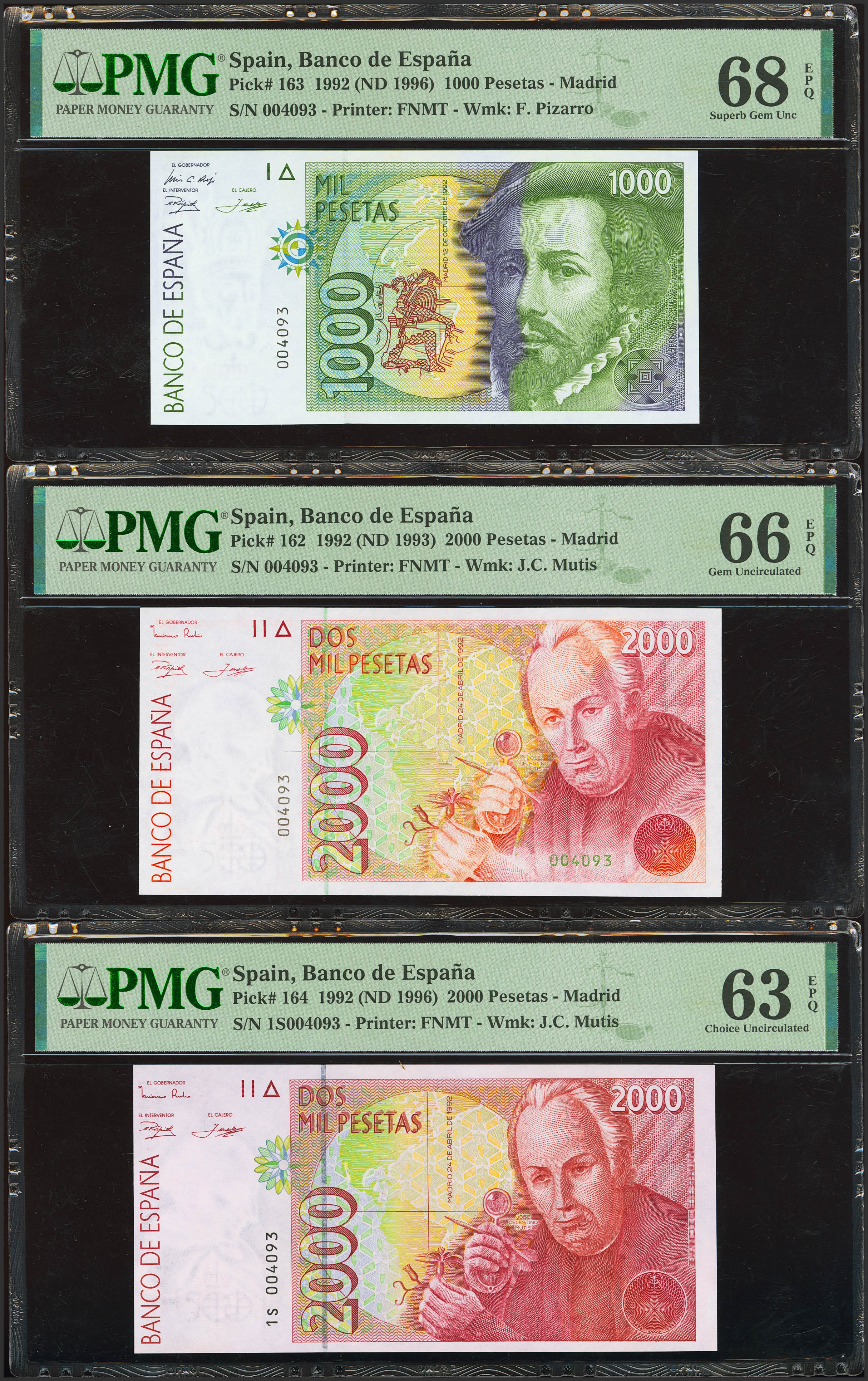 Complete set of 5 banknotes from the 1992 issue (including the 2000 Peseta note from 1995 with series 1S). No series number, all with the same low serial number 004093. (Edifil 2023: 482/85, 482A). Uncirculated. Encapsulated PMG68EPQ, 66EPQ, 63EPQ, 66EPQ, 67EPQ.