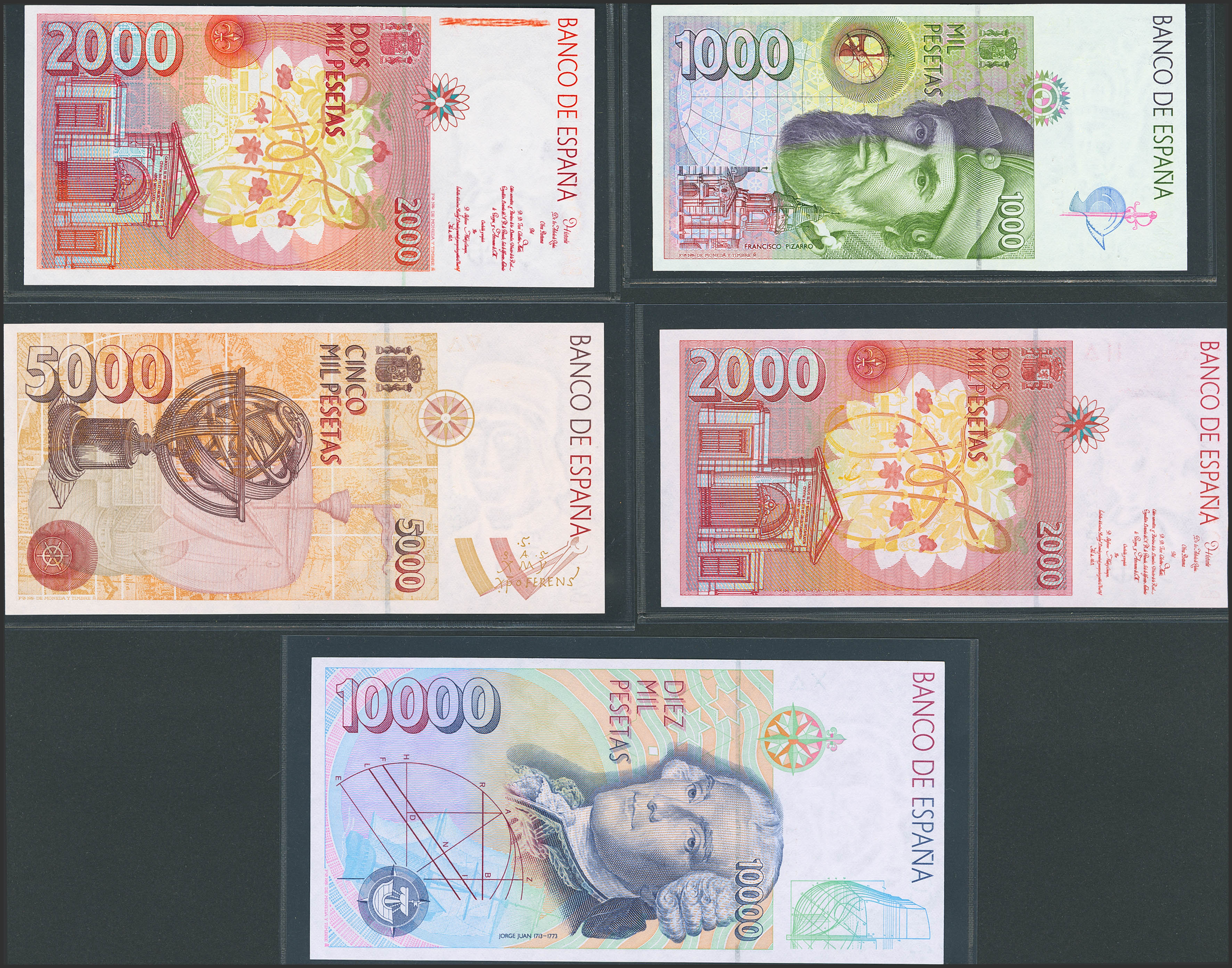 Series of 1000, 2000 (plus another with the number 1S), 5000 and 10000 Peseta banknotes issued in 1992, all with the same serial number Nº004273. (Edifil 2023: 482/85, 482A). Rare set. Uncirculated.
