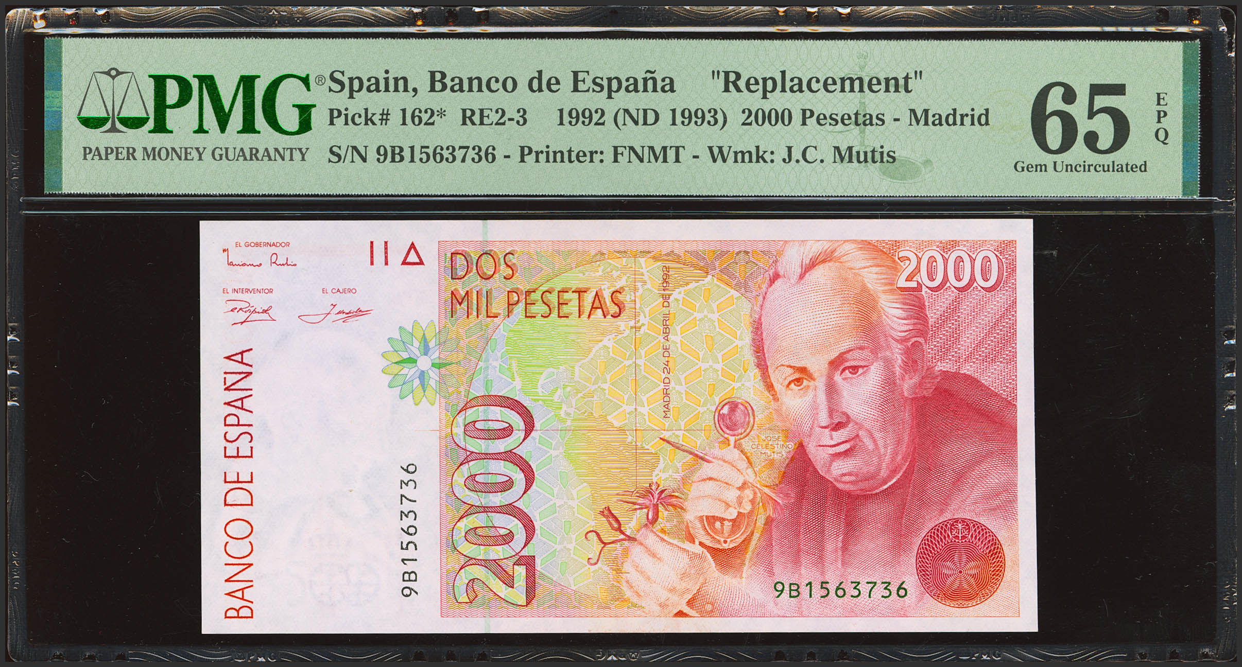 English 2000 Pesetas. April 24, 1992. Special Series 9B. (Edifil 2023: 482c, Pick: 162*). An extraordinarily rare series; to give an idea of ​​its rarity, and based on the available statistical information, we dare say that it is at least as rare as the Rosalía de Castro 9B series. Uncirculated. Packaged in PMG65EPQ.