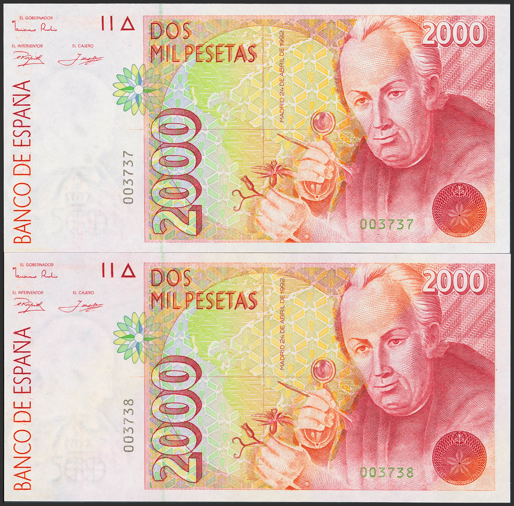 English 2000 Pesetas. April 24, 1992. Consecutive pair. No series and very low numbering. (Edifil 2023: 482). Uncirculated.