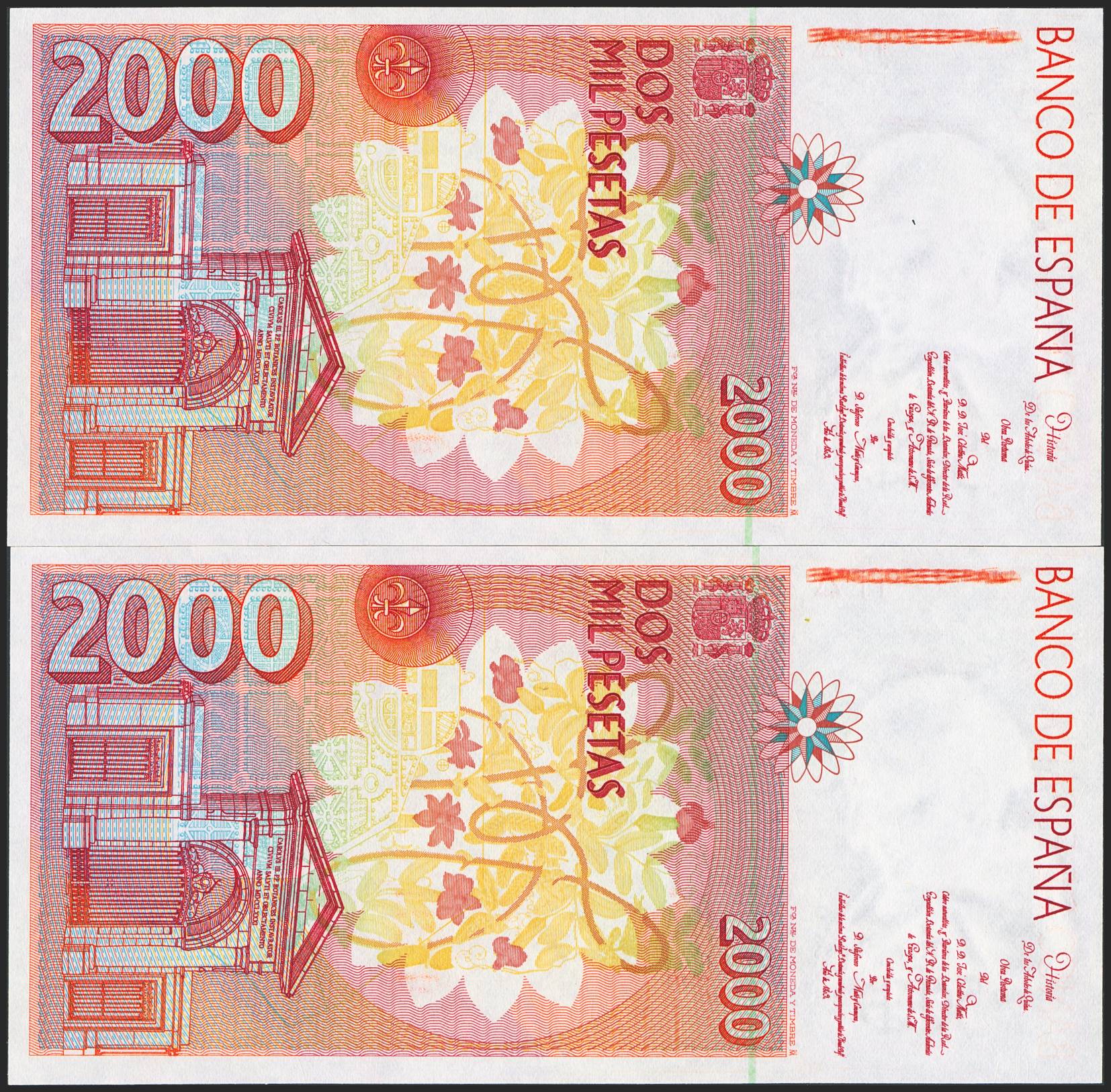 2000 Pesetas. April 24, 1992. Consecutive pair. No series. (Edifil 2023: 482). Uncirculated.