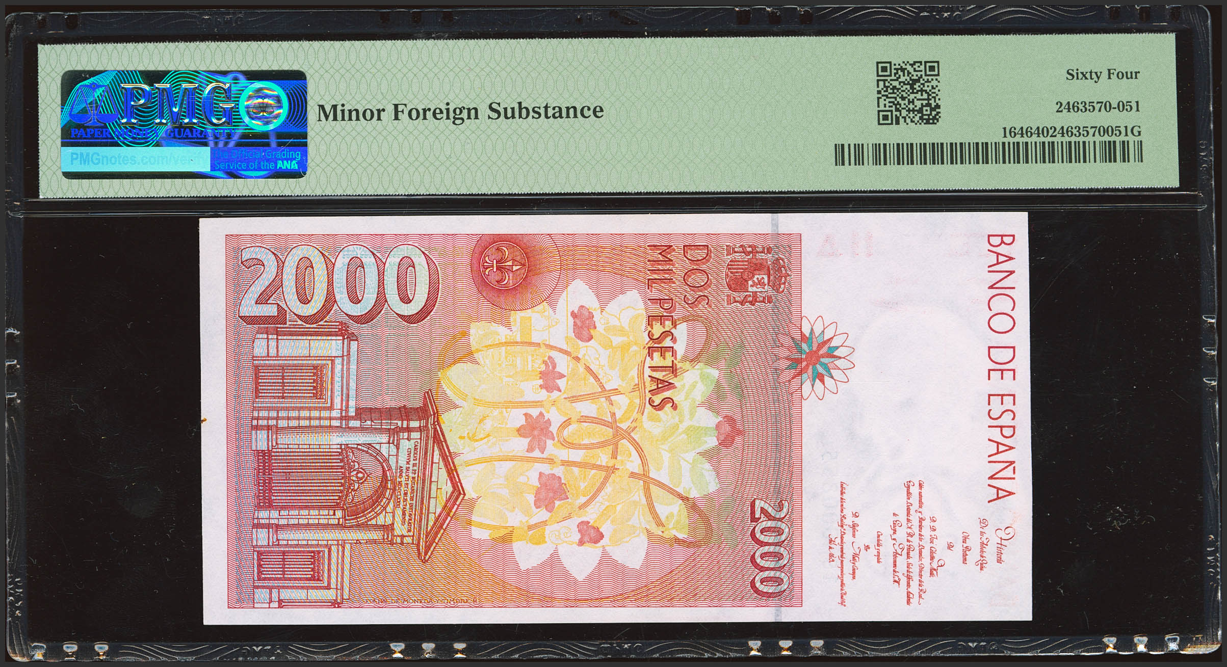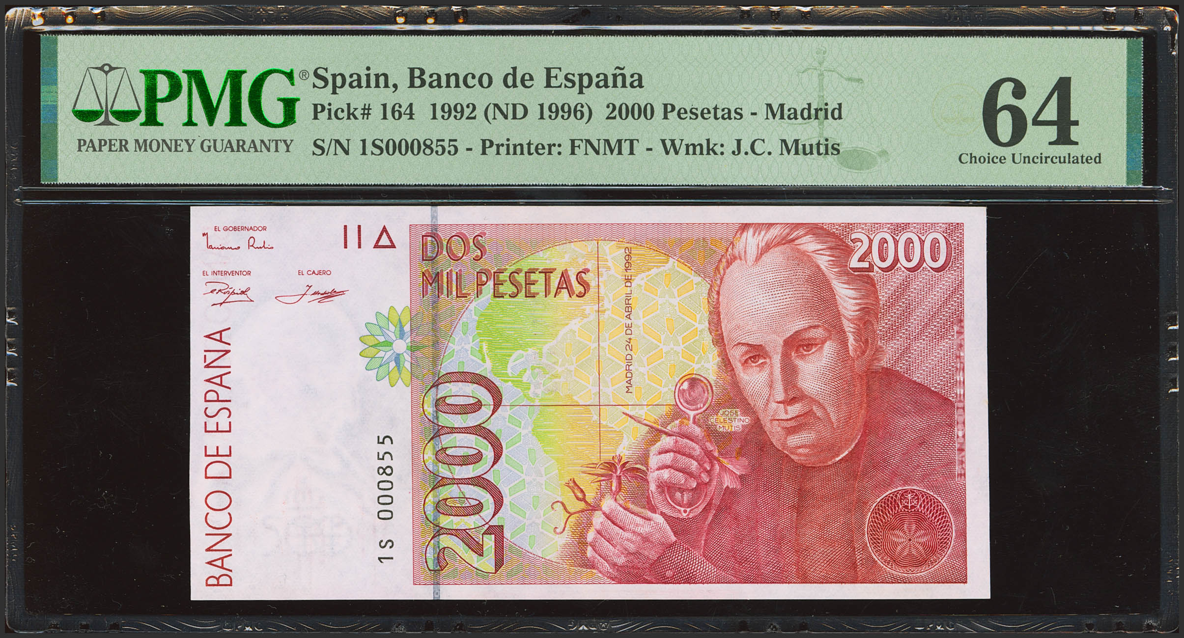 2000 Pesetas. April 24, 1992. 1S series and very low (000855). (Edifil 2023: 482A, Pick: 164*). Uncirculated. PMG64 (minor foreign substance) package.
