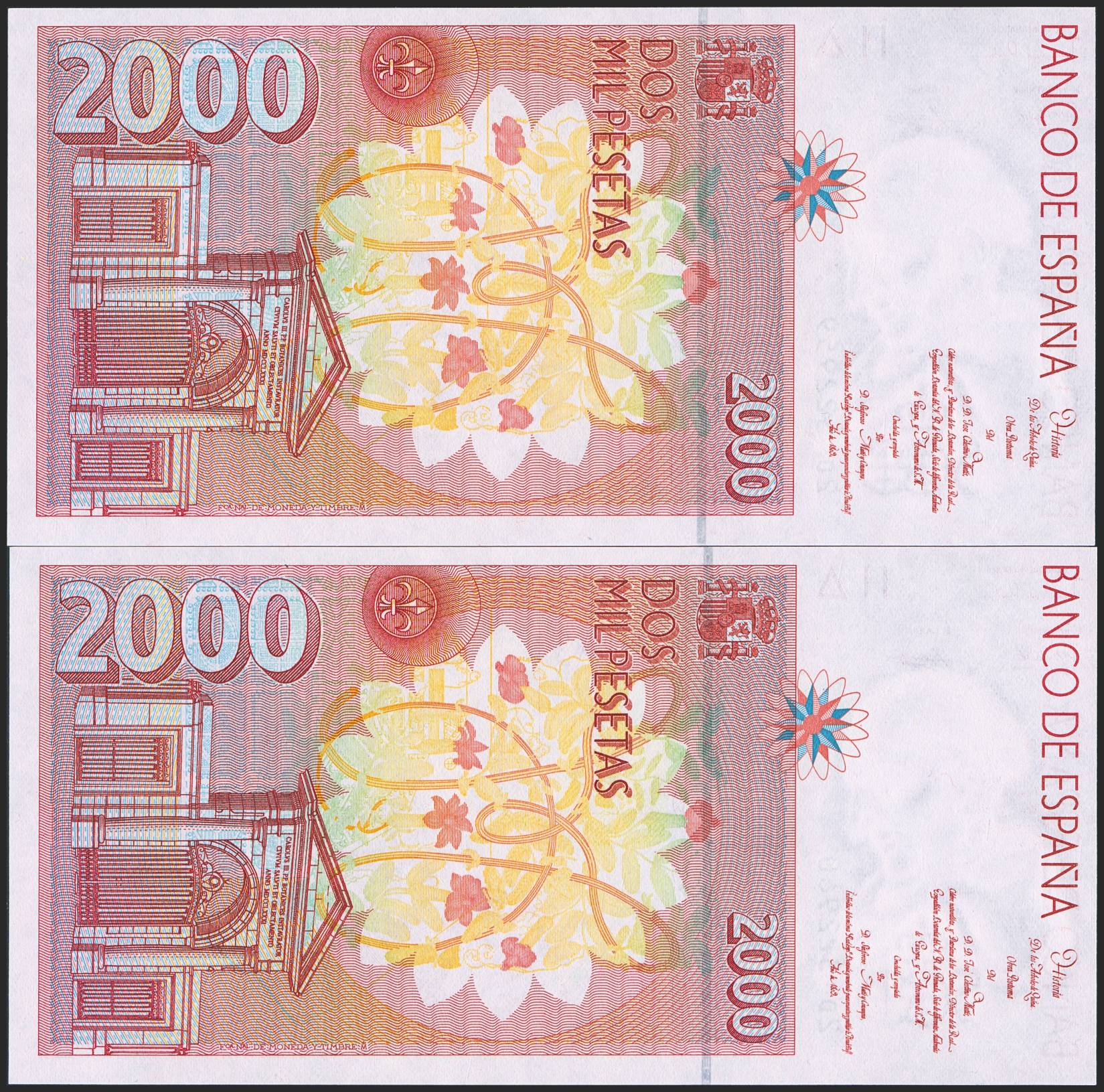 English 2000 Pesetas. April 24, 1992. Consecutive pair. Series 2D. (Edifil 2023: 482Aa). Uncirculated.