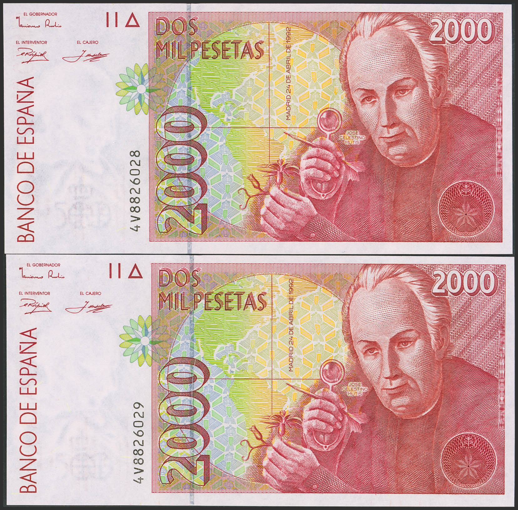 English 2000 Pesetas. April 24, 1992. Consecutive pair. Series 4V. (Edifil 2023: 482Aa). Uncirculated.