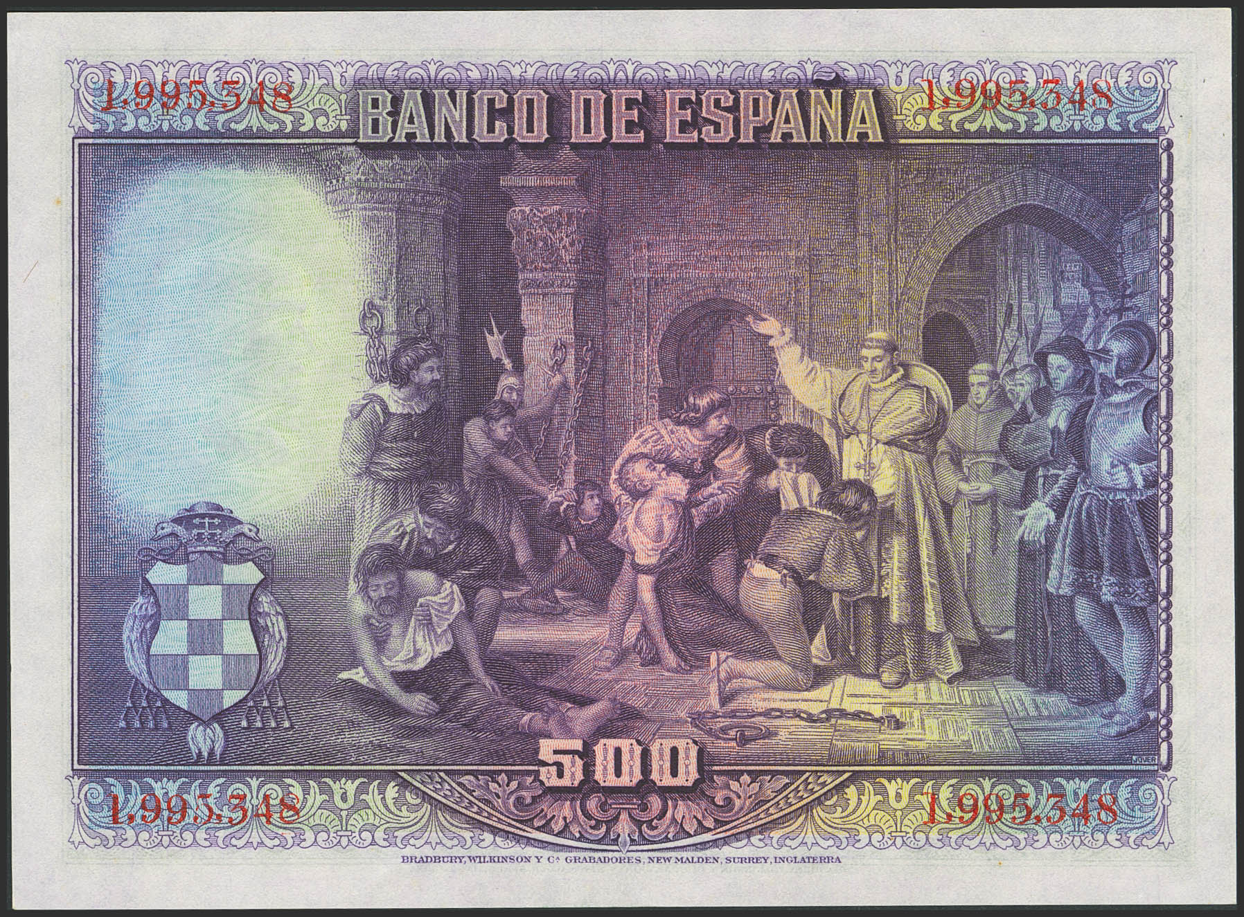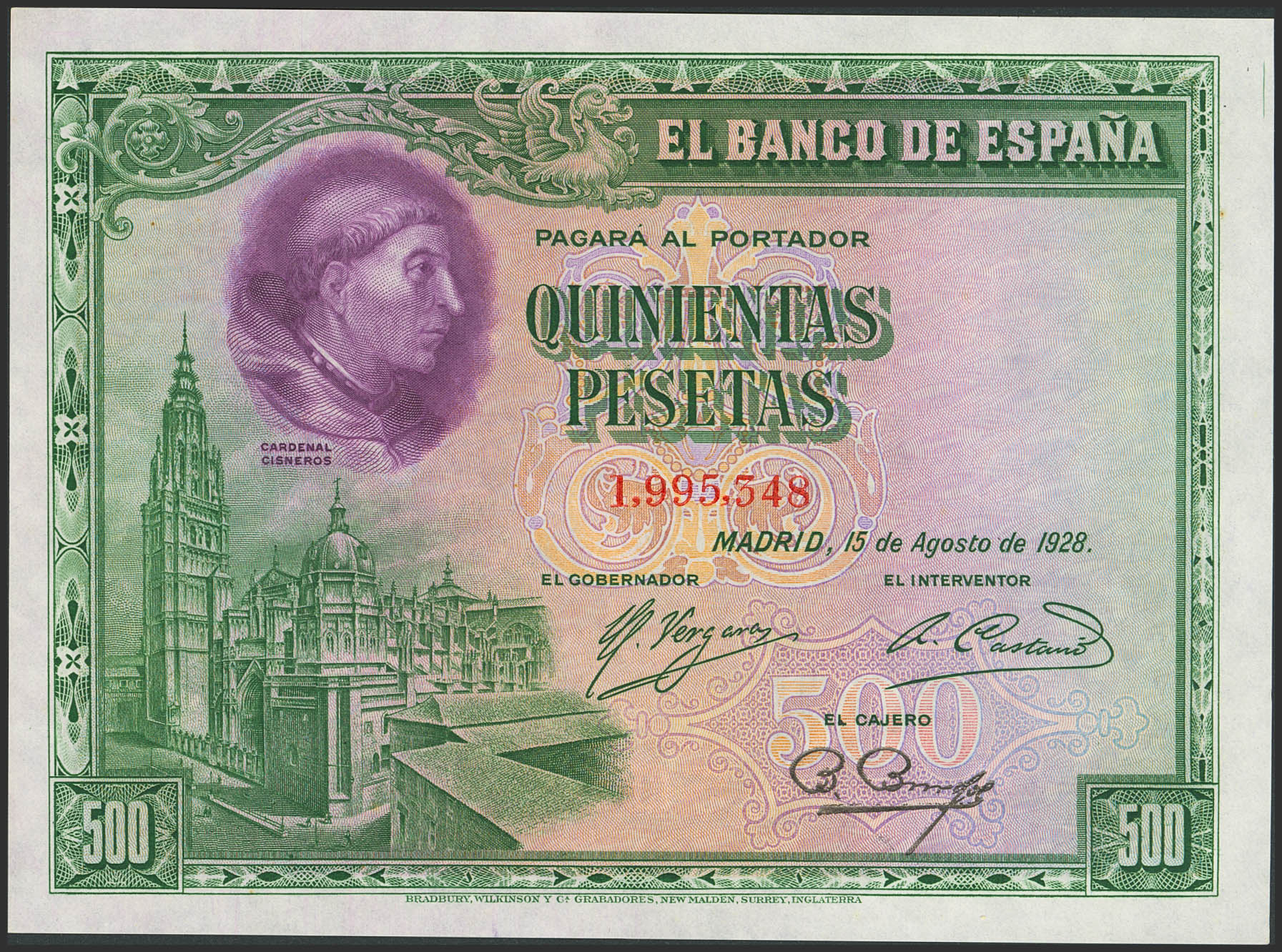 English 500 Pesetas. August 15, 1928. No series. (Edifil 2023: 356). Original finish. Uncirculated.