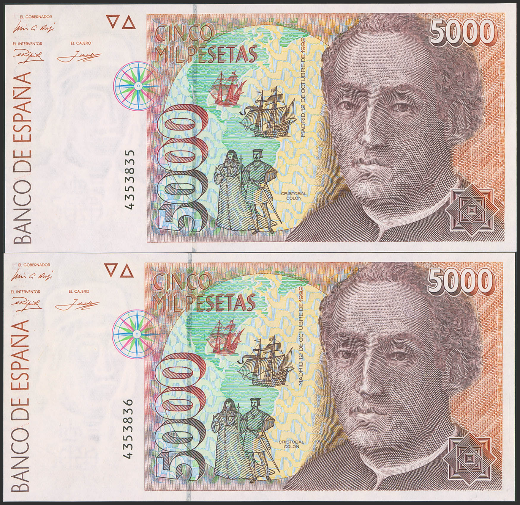5000 Pesetas. October 12, 1992. Consecutive pair. No series. (Edifil 2023: 484). Uncirculated-