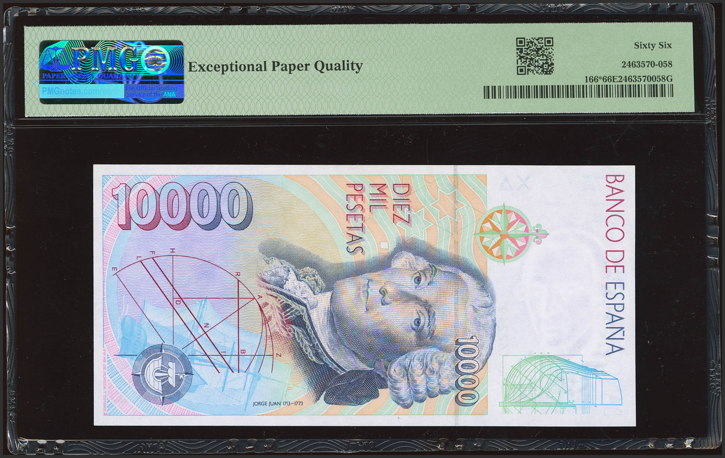 10,000 Pesetas. October 12, 1992. Special Series 9A. (Edifil 2023: 485b, Pick: 166*). Rare in this exceptional condition. Uncirculated. Packaged in PMG66EPQ.