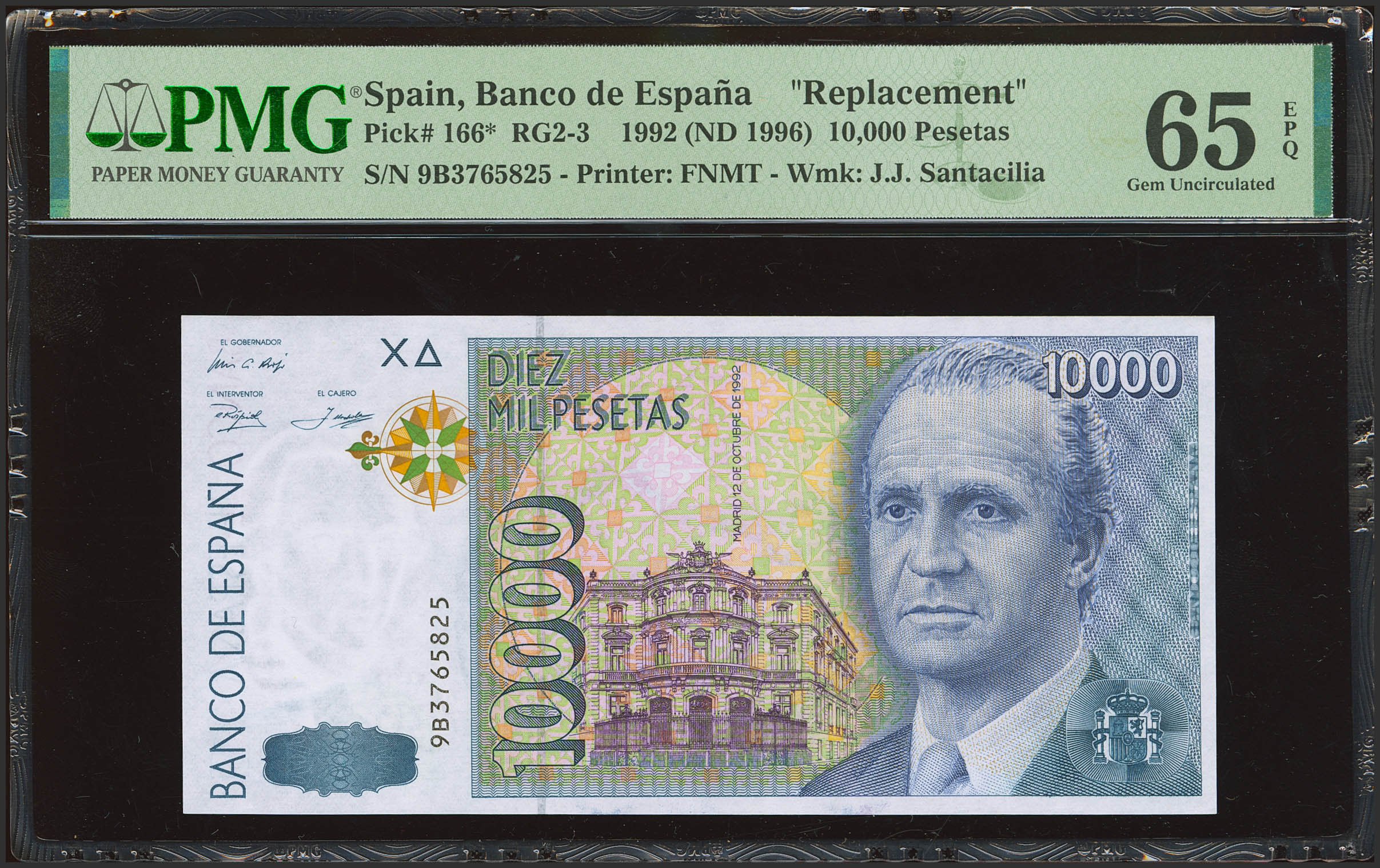 English 10,000 Pesetas. October 12, 1992. Special Series 9B. (Edifil 2023: 485b, Pick: 166*). A rare series, undoubtedly more difficult to find than the 9A series of the same type. Uncirculated. PMG65EPQ package.