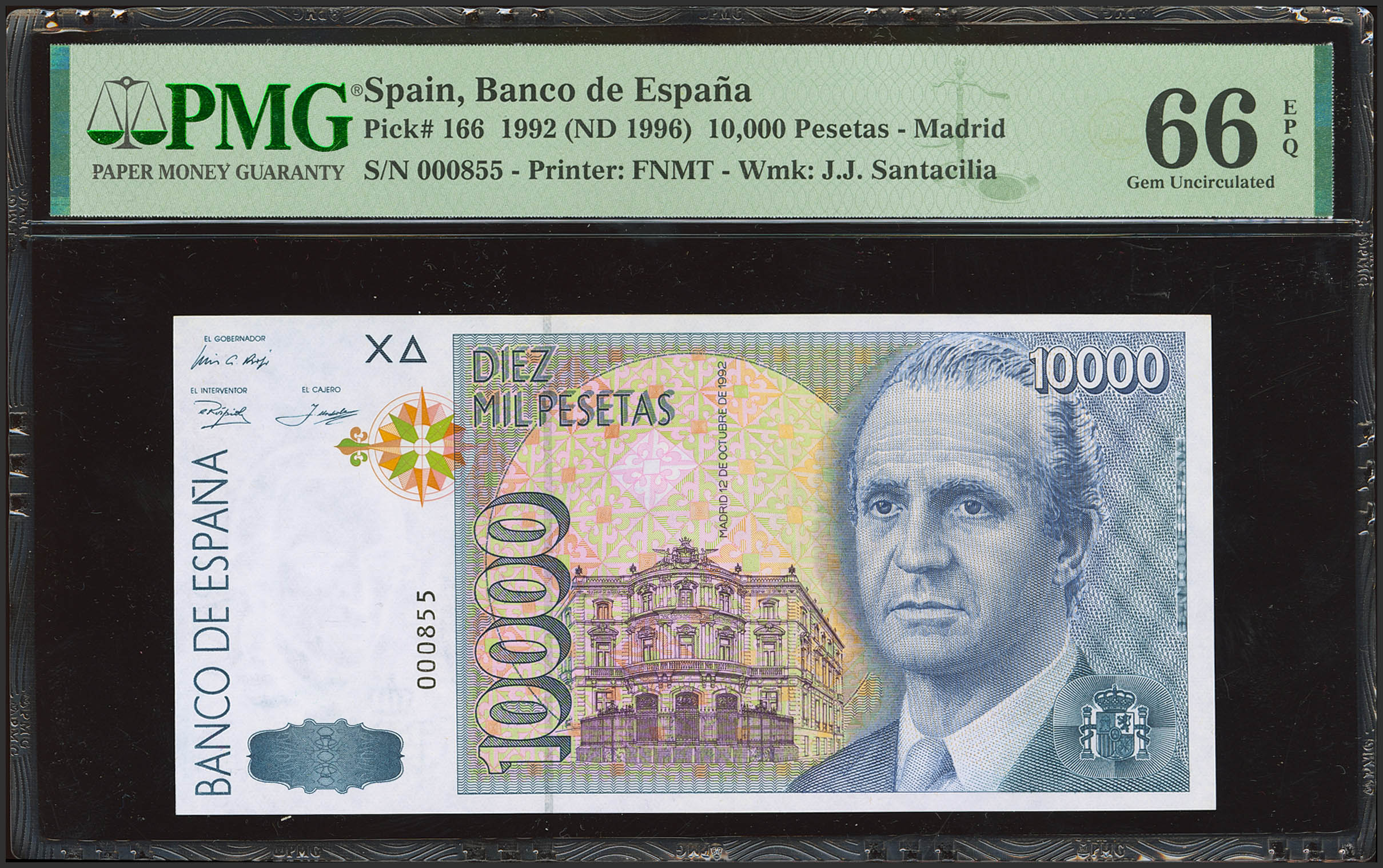 10,000 Pesetas. October 12, 1992. No series and very low numbering (000855). (Edifil 2023: 485). Uncirculated. PMG66EPQ encapsulation.