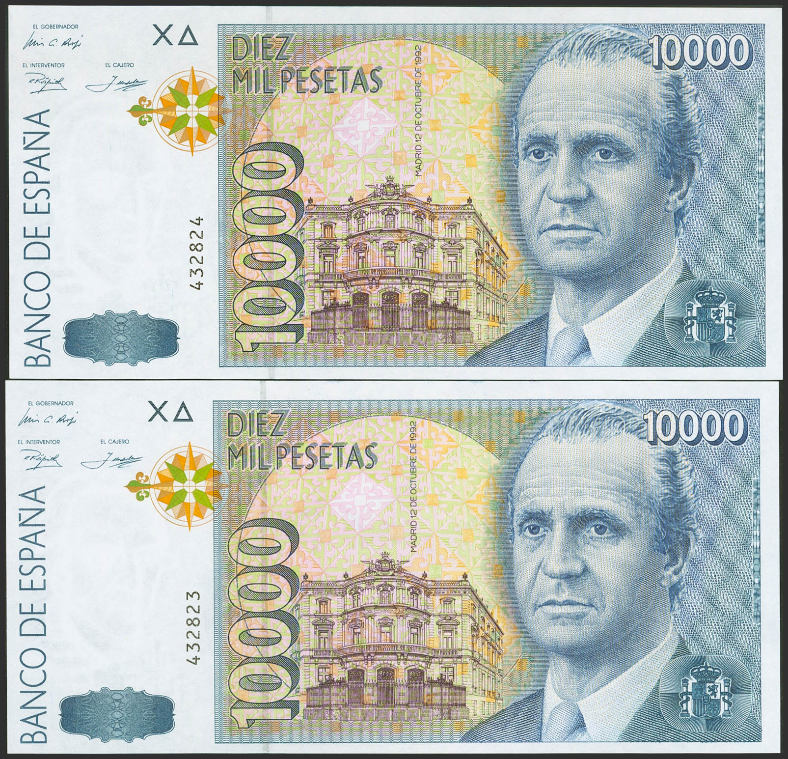 10,000 Pesetas. October 12, 1992. Consecutive pair. No series. (Edifil 2021: 485). Uncirculated.
