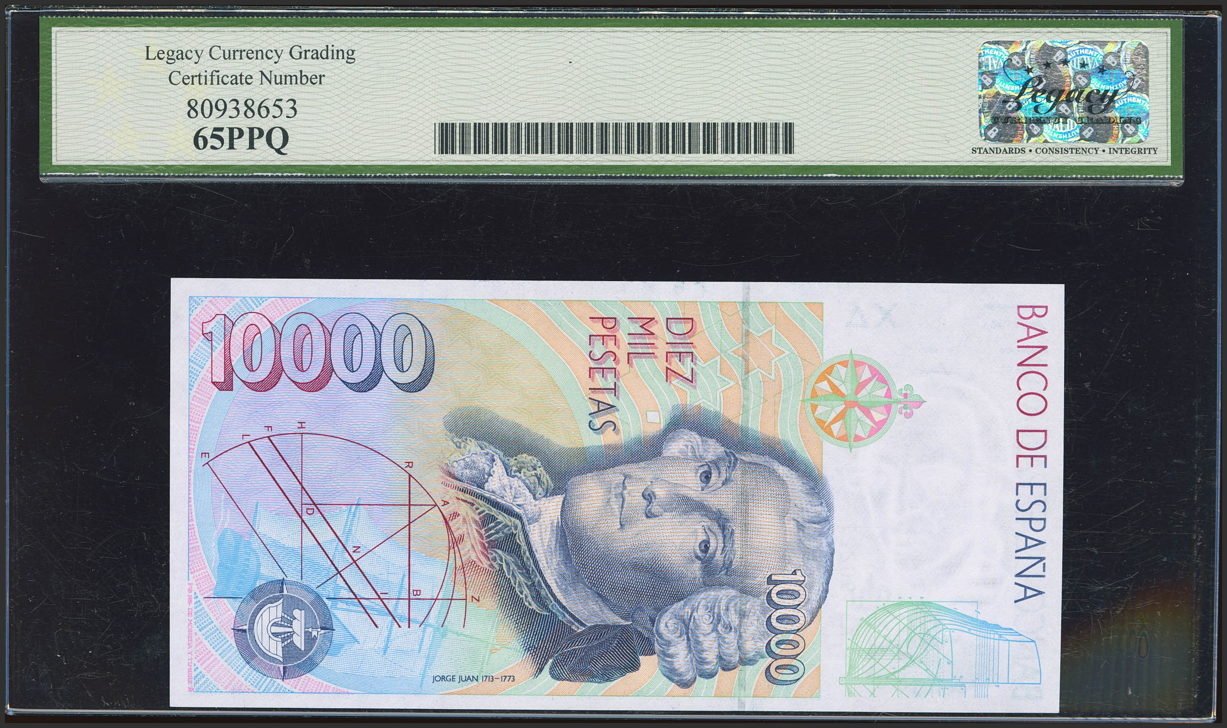 English 10,000 Pesetas. October 12, 1992. Series A. (Edifil 2023: 485a, Pick: 166). Uncirculated. LEGACY65PPQ encapsulation.