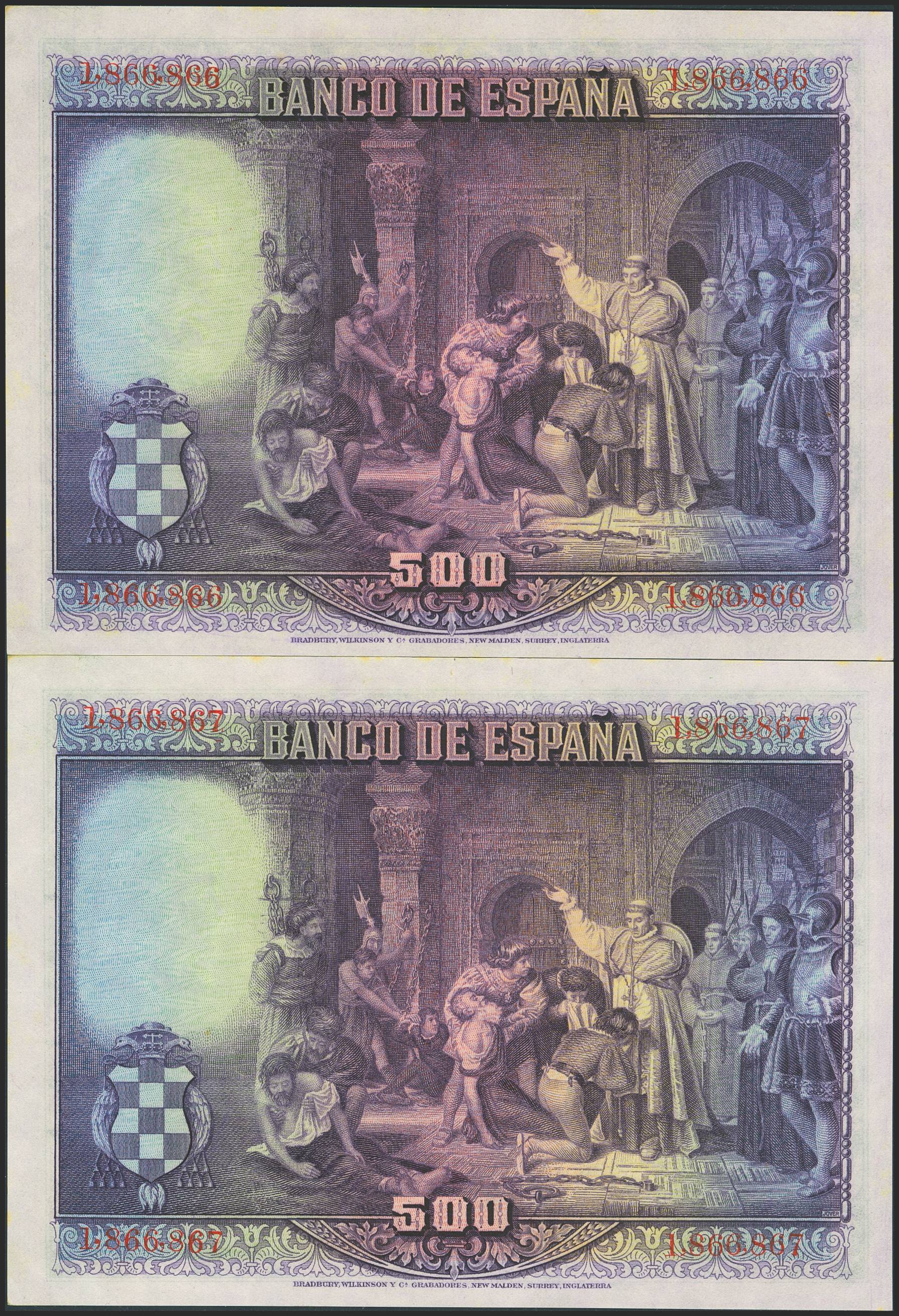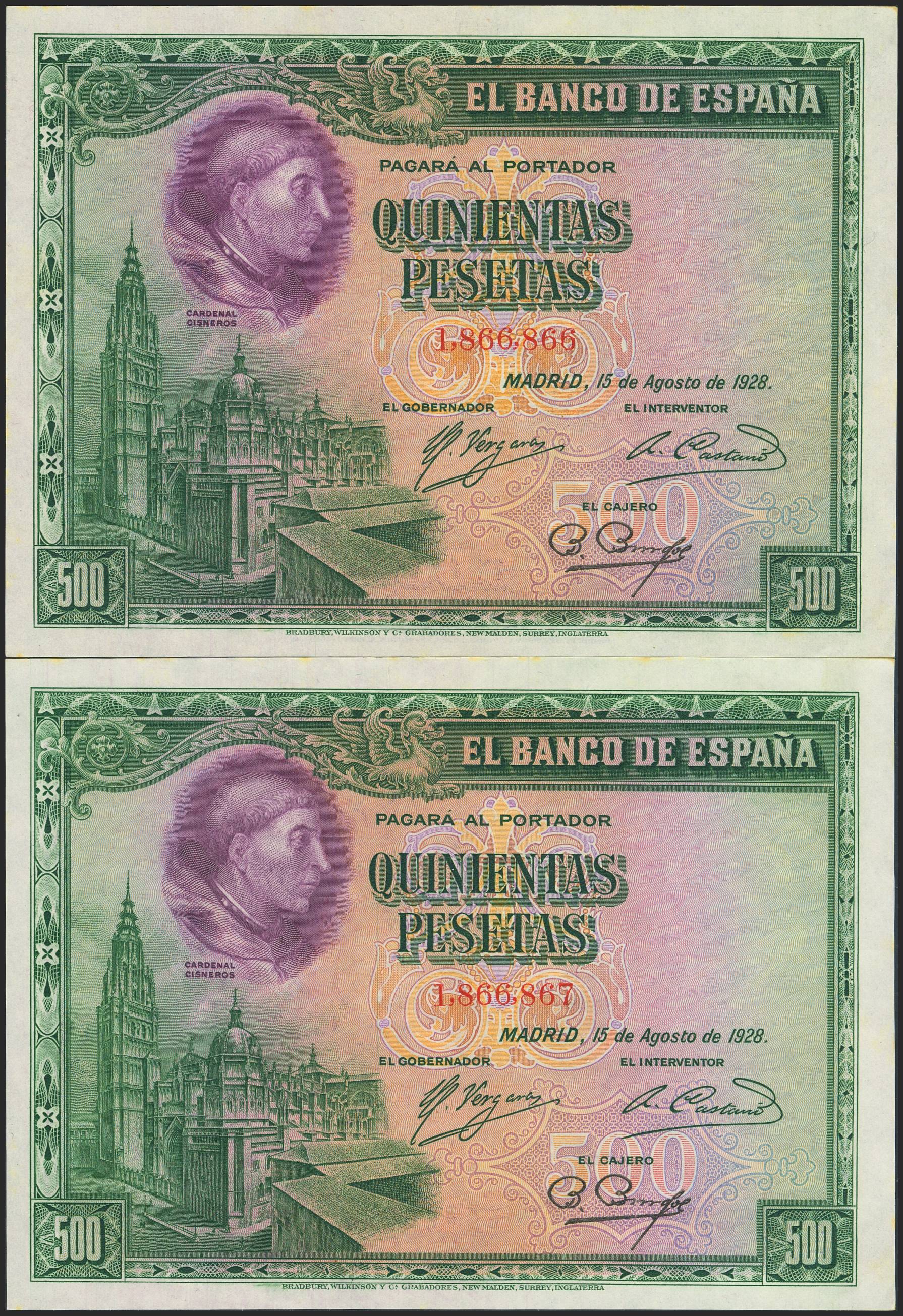500 Pesetas. August 15, 1928. Consecutive pair. No series. (Edifil 2023: 356). Original finish. Uncirculated-.