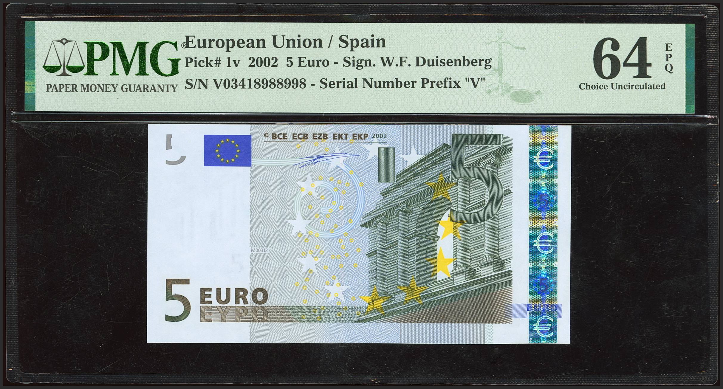 5 Euros. 2002. Duisenberg signature. Series V (Spain). (Edifil 2023: 486, Pick: 1v). Uncirculated. PMG64EPQ package.
