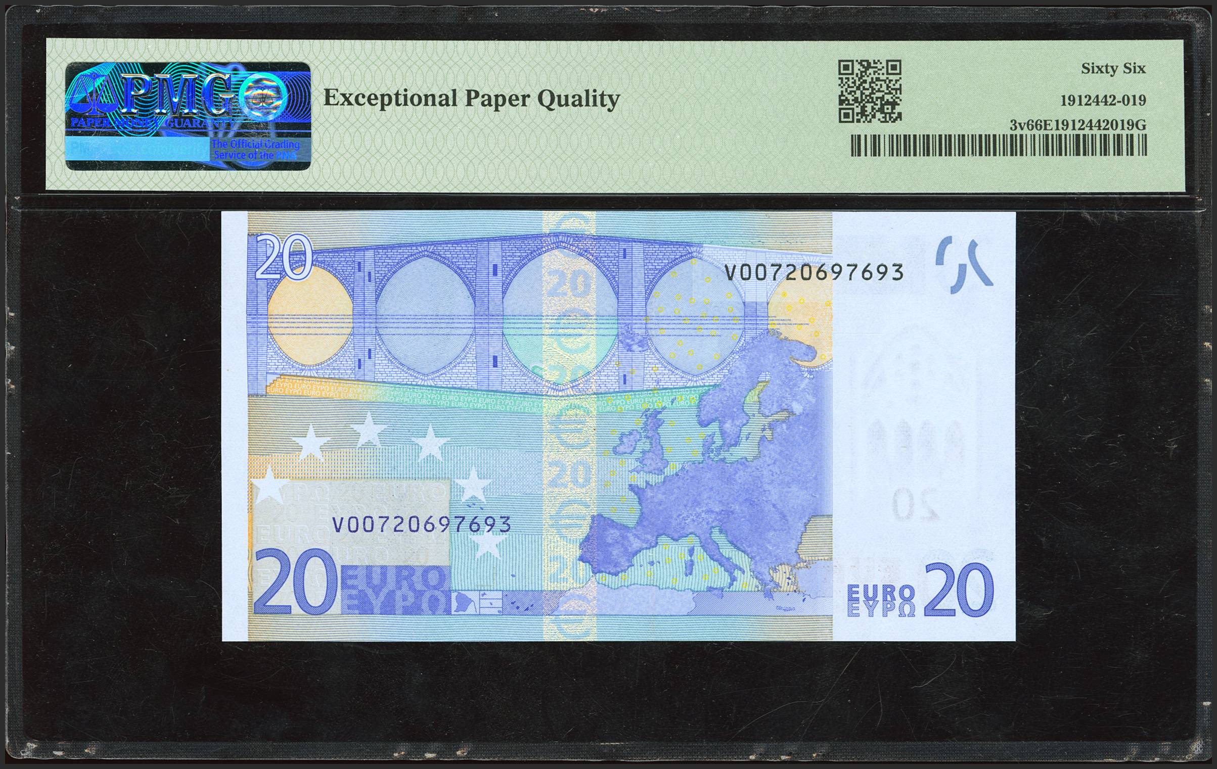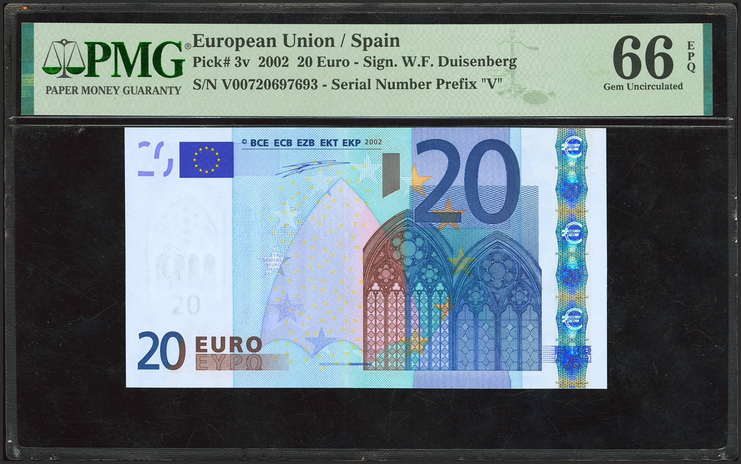 20 Euros. 2002. Duisenberg signature. Series V (Spain). (Edifil 2023: 488, Pick: 3v). Uncirculated. PMG66EPQ package.