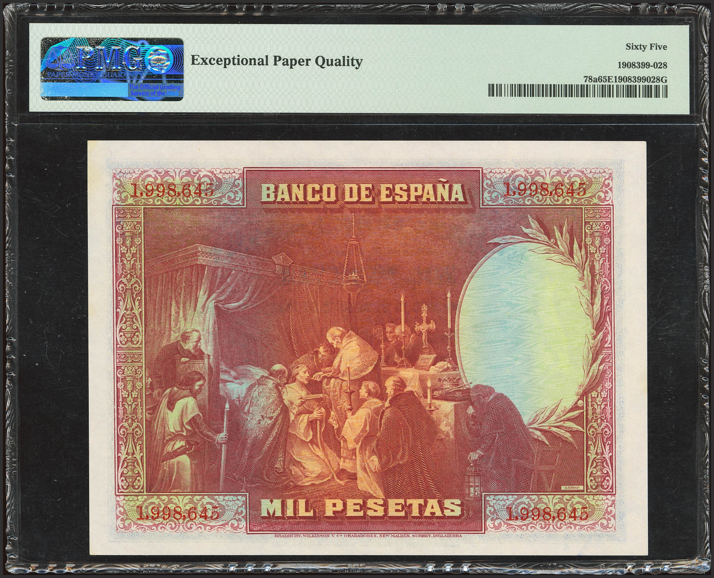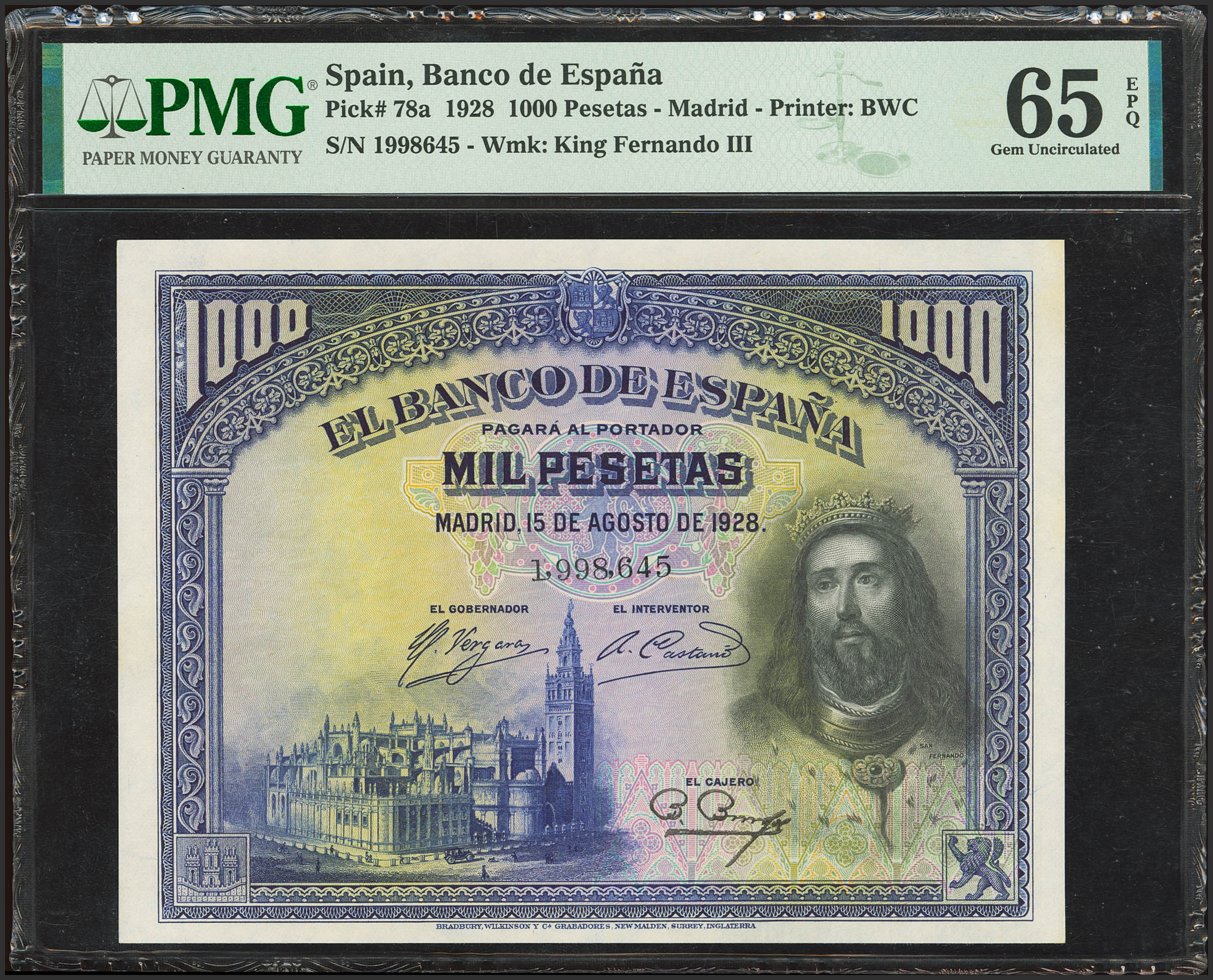 1000 Pesetas. August 15, 1928. No serial number. (Edifil 2023: 357, Pick: 78a). Original finish. Uncirculated. PMG65EPQ encapsulated.