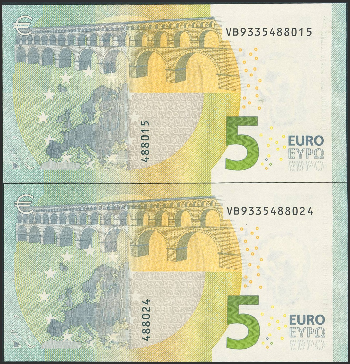 5 Euros. May 2, 2013. Consecutive pair (it should be noted that the last digit in the serial number of all euro banknotes is for internal control by the European Central Bank; the penultimate digit indicates the serial number). Draghi signature. VB series (Spain). (Edifil 2023: 493a). Uncirculated.