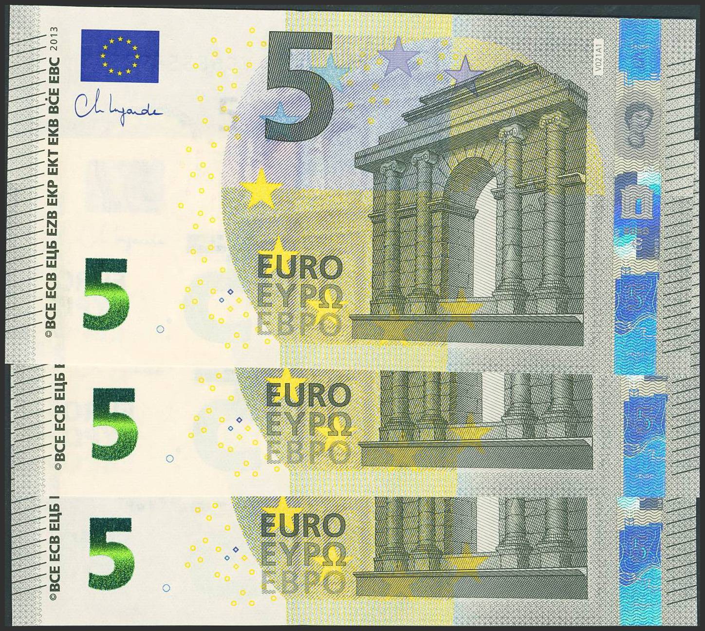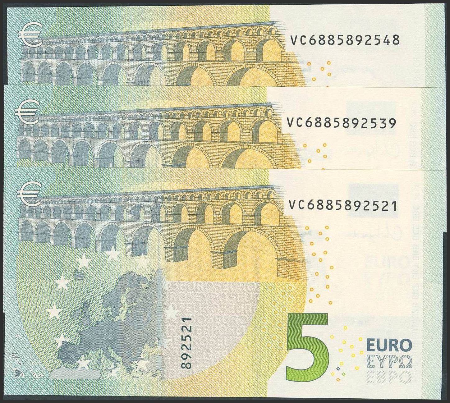 5 Euros. November 2013. Consecutive trio (it should be noted that the last digit of all euro banknotes is for internal control by the European Central Bank; the penultimate digit indicates the sequence of the banknotes). Signature Lagarde. VC Series (Spain). (Edifil 2023: 493Aa). Uncirculated.