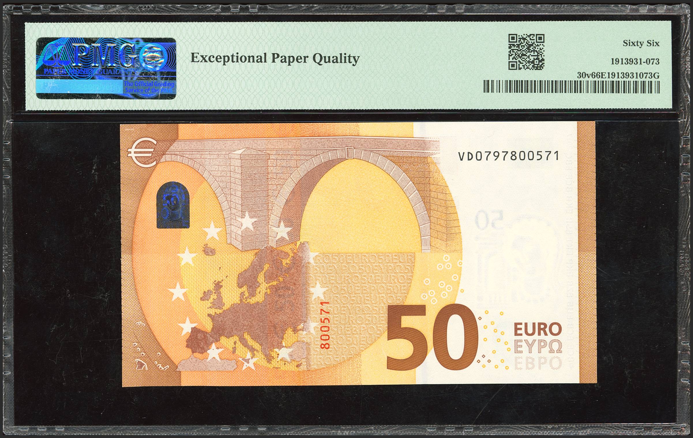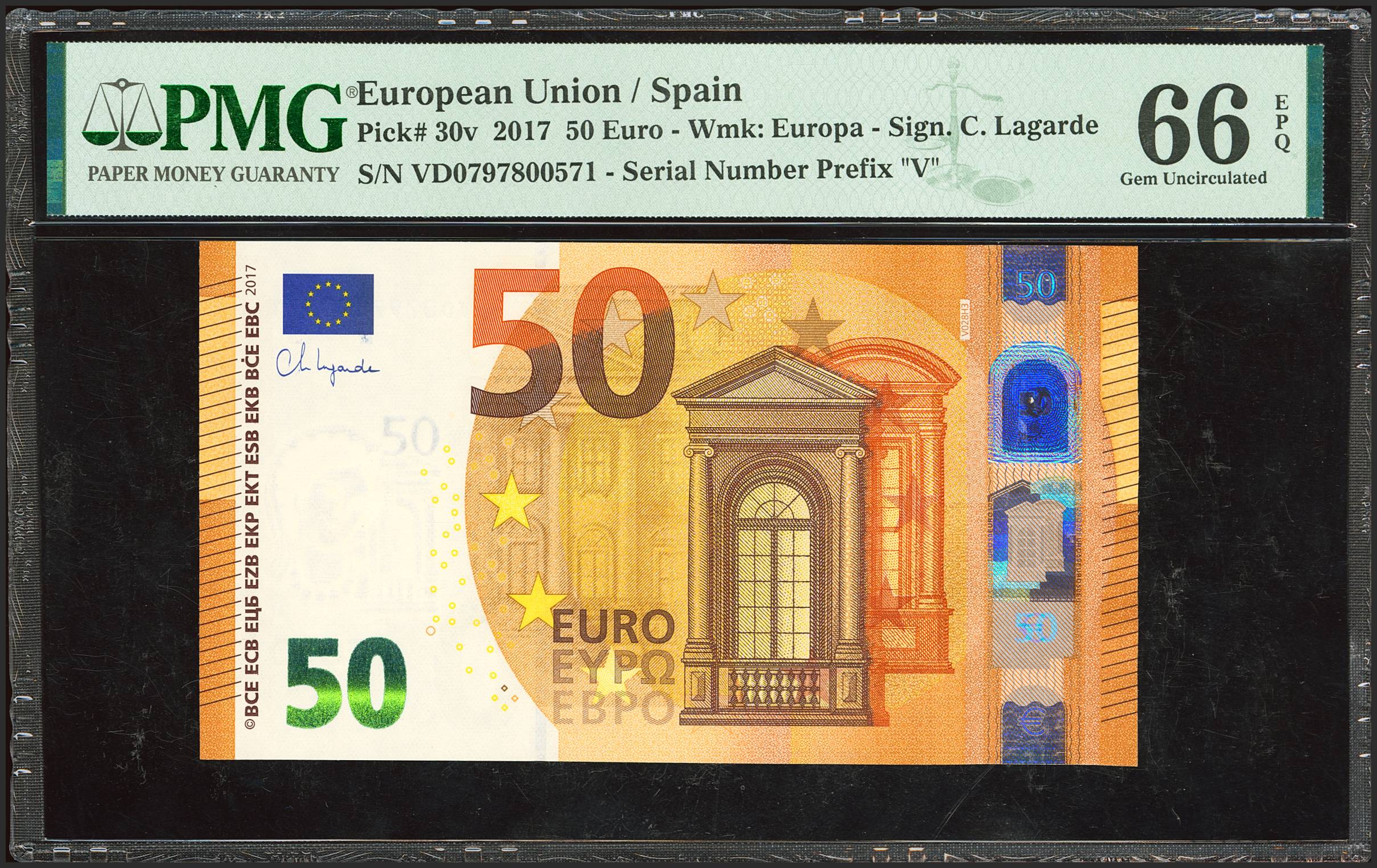 50 Euros. 2017. Lagarde brand. Series V (Spain). (Edifil 2023: 496Aa, Pick: 30v). Uncirculated. PMG66EPQ package.