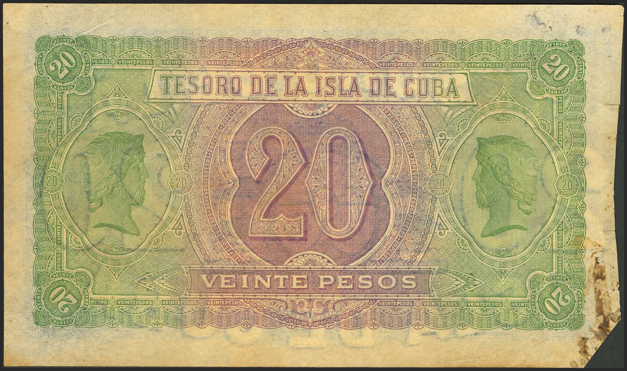 Spanish Bank of the Island of Cuba. 20 Pesos. August 12, 1891. Without series and without signatures like the known examples of this issue. (Edifil 2023: 65). Very rare. VF+.