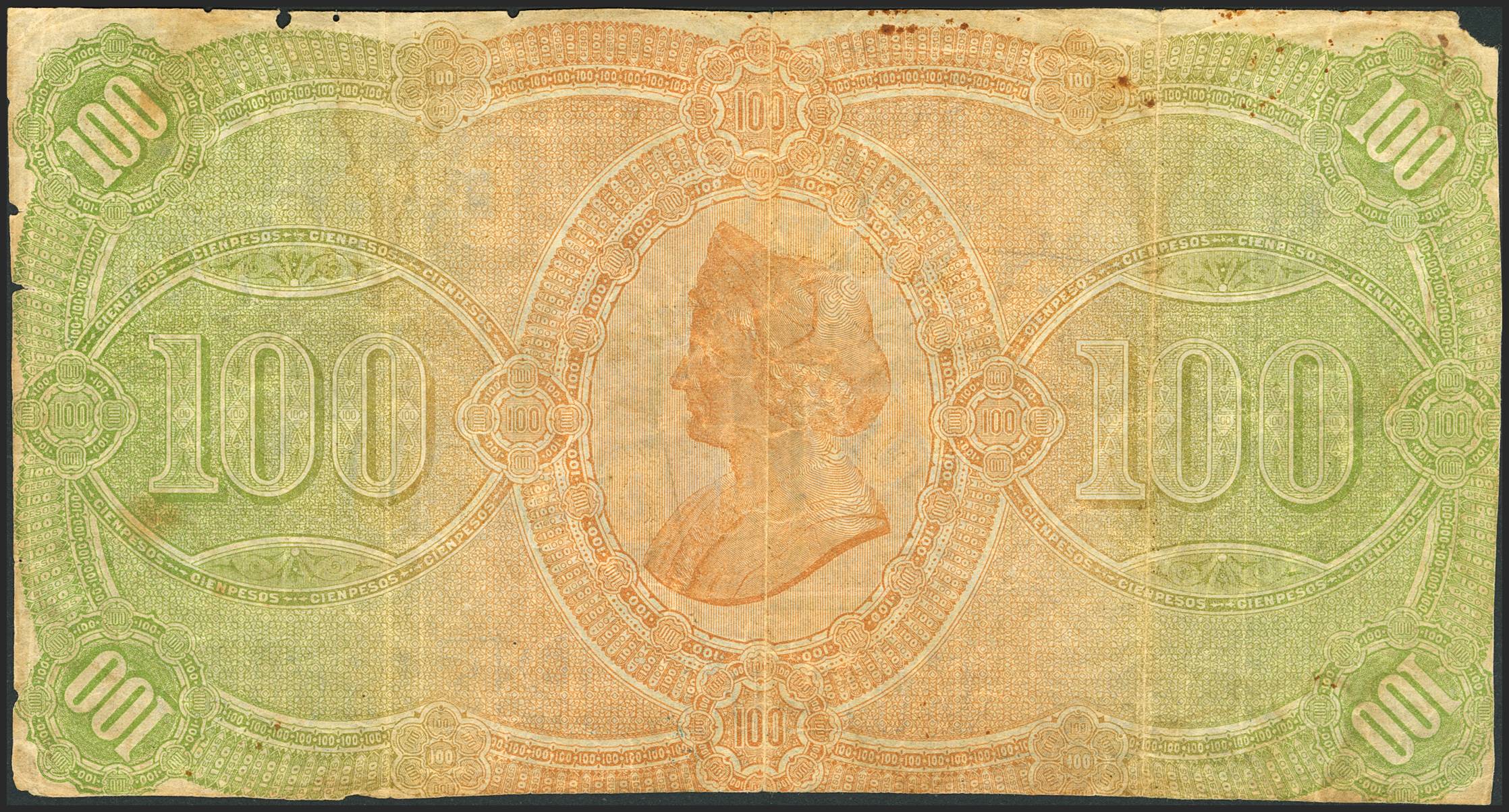 Spanish Bank of the Island of Cuba. 50 Pesos. May 15, 1896. Series C and dated with a stamp. (Edifil 2023: 75). Extremely rare, moth damage. VF-.