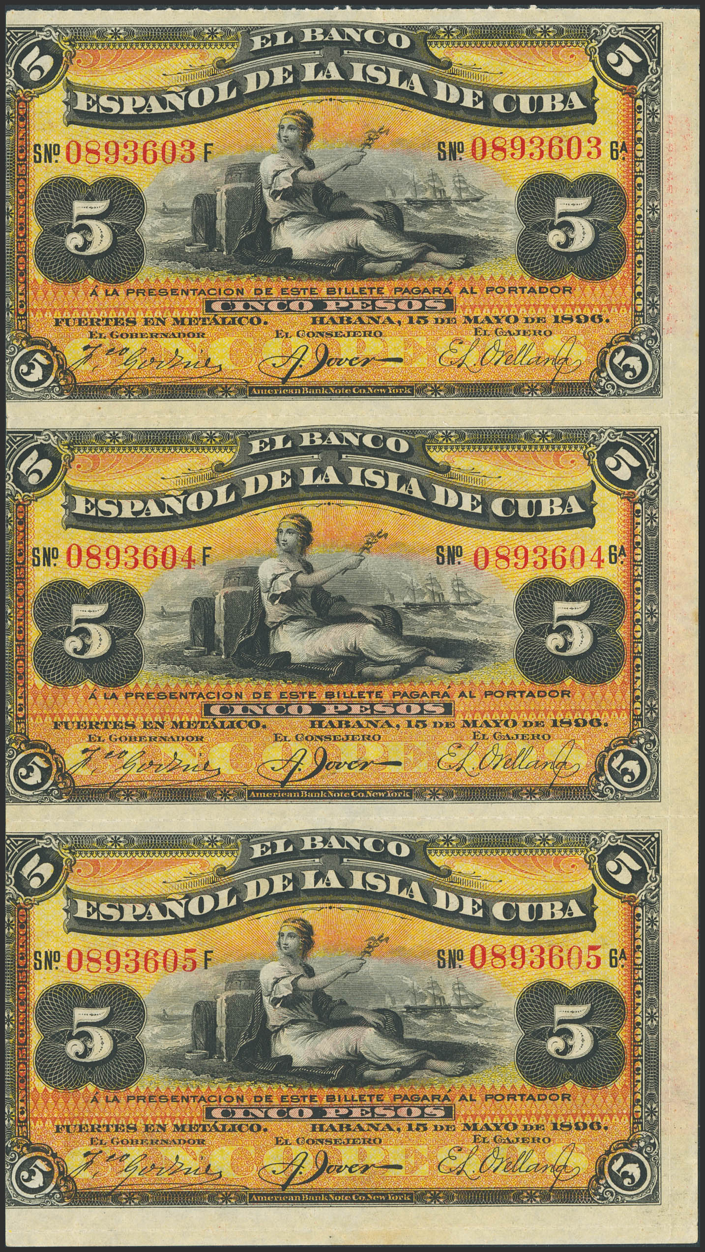 SPANISH BANK OF THE ISLAND OF CUBA. Set of 3 consecutive 5 Peso banknotes (not detached), issued on May 15, 1896, series F and with the surcharge SILVER on the back. (Edifil 2023: 81). Unusual. UNC/UNC-.