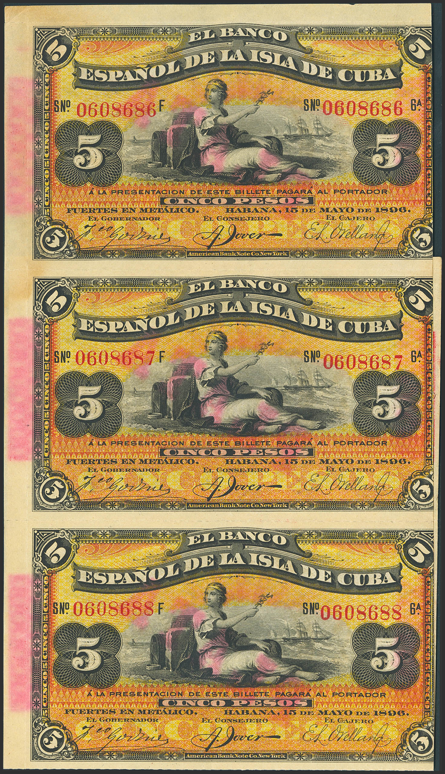 SPANISH BANK OF THE ISLAND OF CUBA. Set of 5 consecutive 5 Peso banknotes (unsealed), issued on May 15, 1896, series F and surcharged SILVER on the back and slightly traced on the front. (Edifil 2023: 81). Unusual. Uncirculated/Good Extremely Fine.