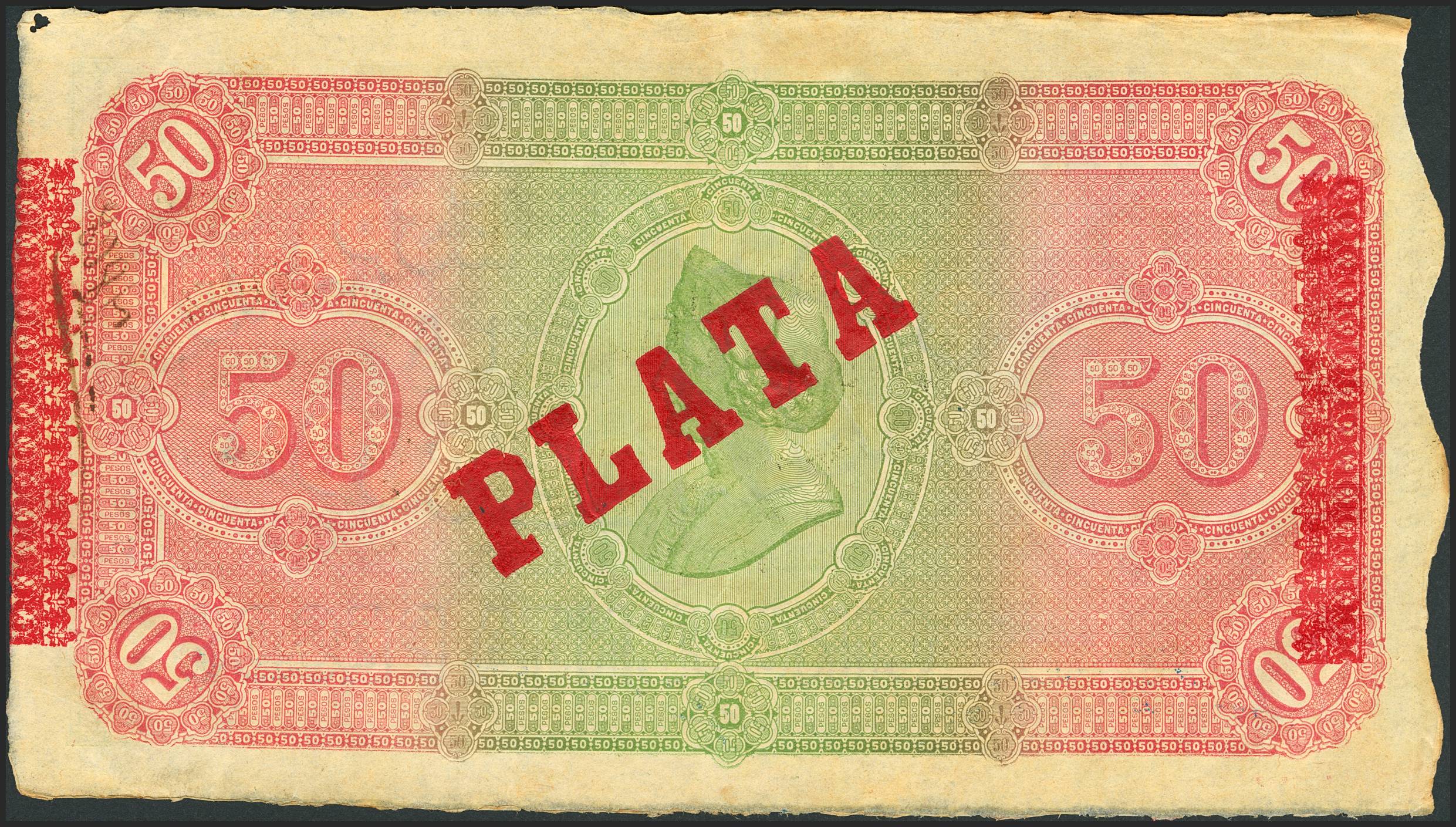 English CUBA. 50 Pesos. (1896ca). Silver overprint, on the reverse. (Edifil 2023: 83). EF-.