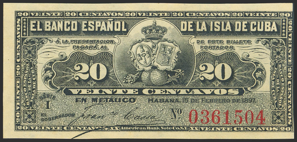 SPANISH BANK OF THE ISLAND OF CUBA. 20 Centavos. February 15, 1897. Series I. (Edifil 2023: 85). Original finish. Uncirculated.