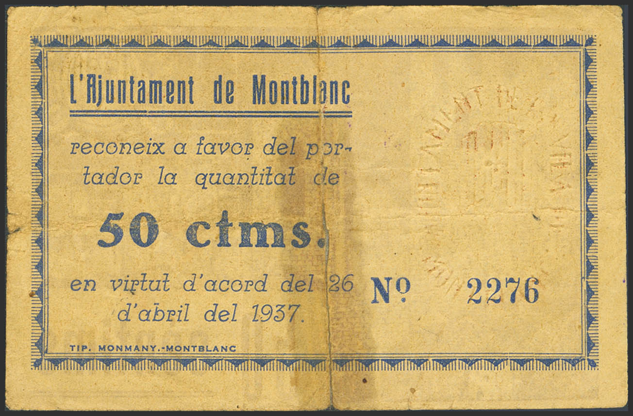 MONTBLANC (TARRAGONA). 50 Centimos. April 26, 1937. (González: 8747). Unusual, presence of adhesive tape. Fine.