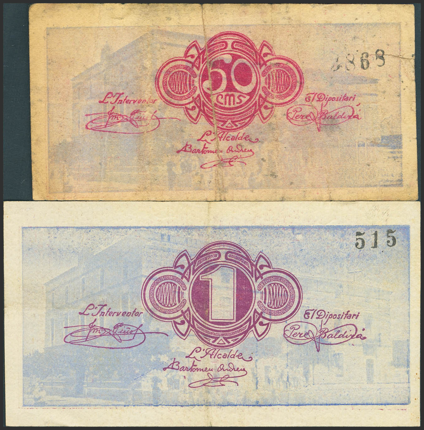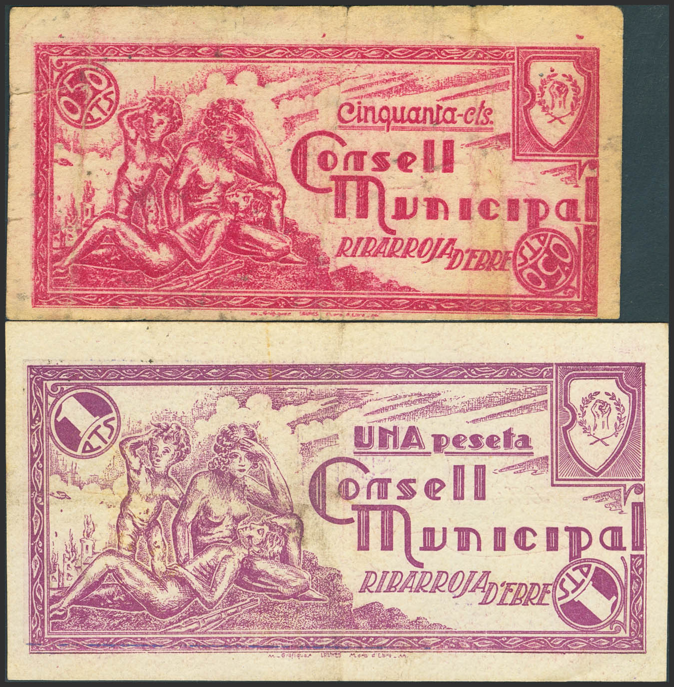 RIBARROJA DE EBRE (TARRAGONA). 50 Cents and 1 Peseta. (1937ca). (González: 9607, 9608). Rare. Very Fine-.