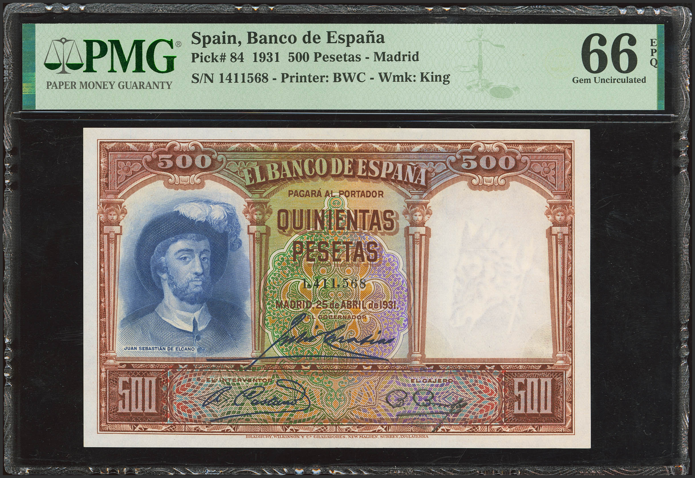 500 Pesetas. April 25, 1931. No serial number. (Edifil 2023: 361, Pick: 84). Original finish. Uncirculated. PMG66EPQ encapsulated.
