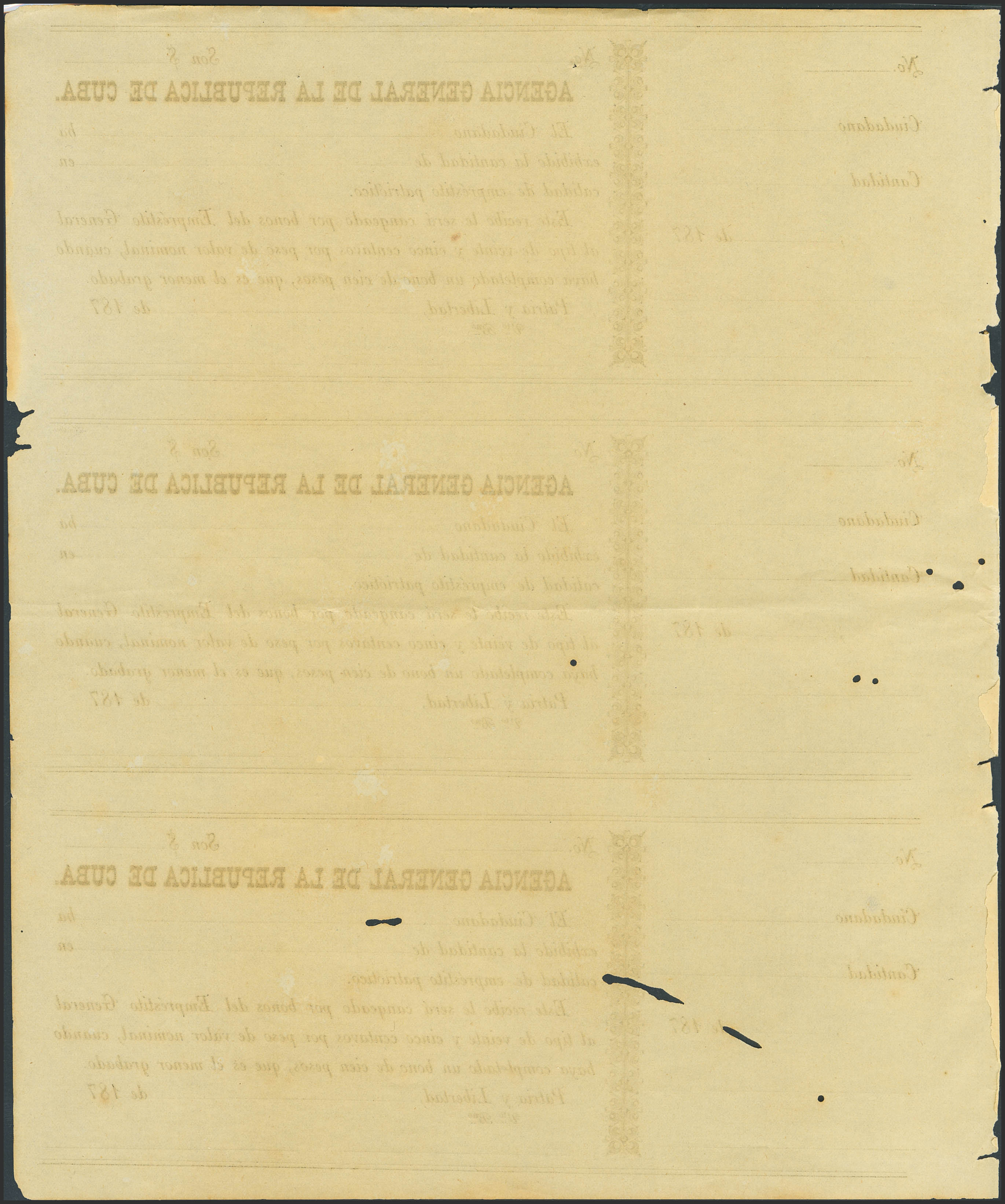 English Set of three PATRIOTIC LOANS FROM THE GENERAL AGENCY OF THE REPUBLIC OF CUBA, uncut. (1870ca). Moth spots. Uncirculated-.