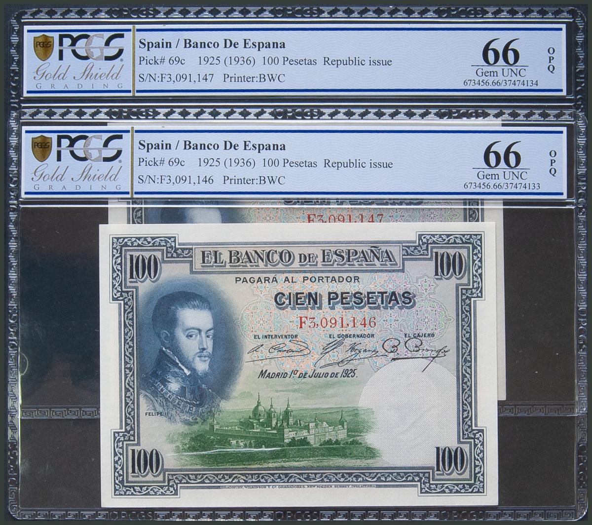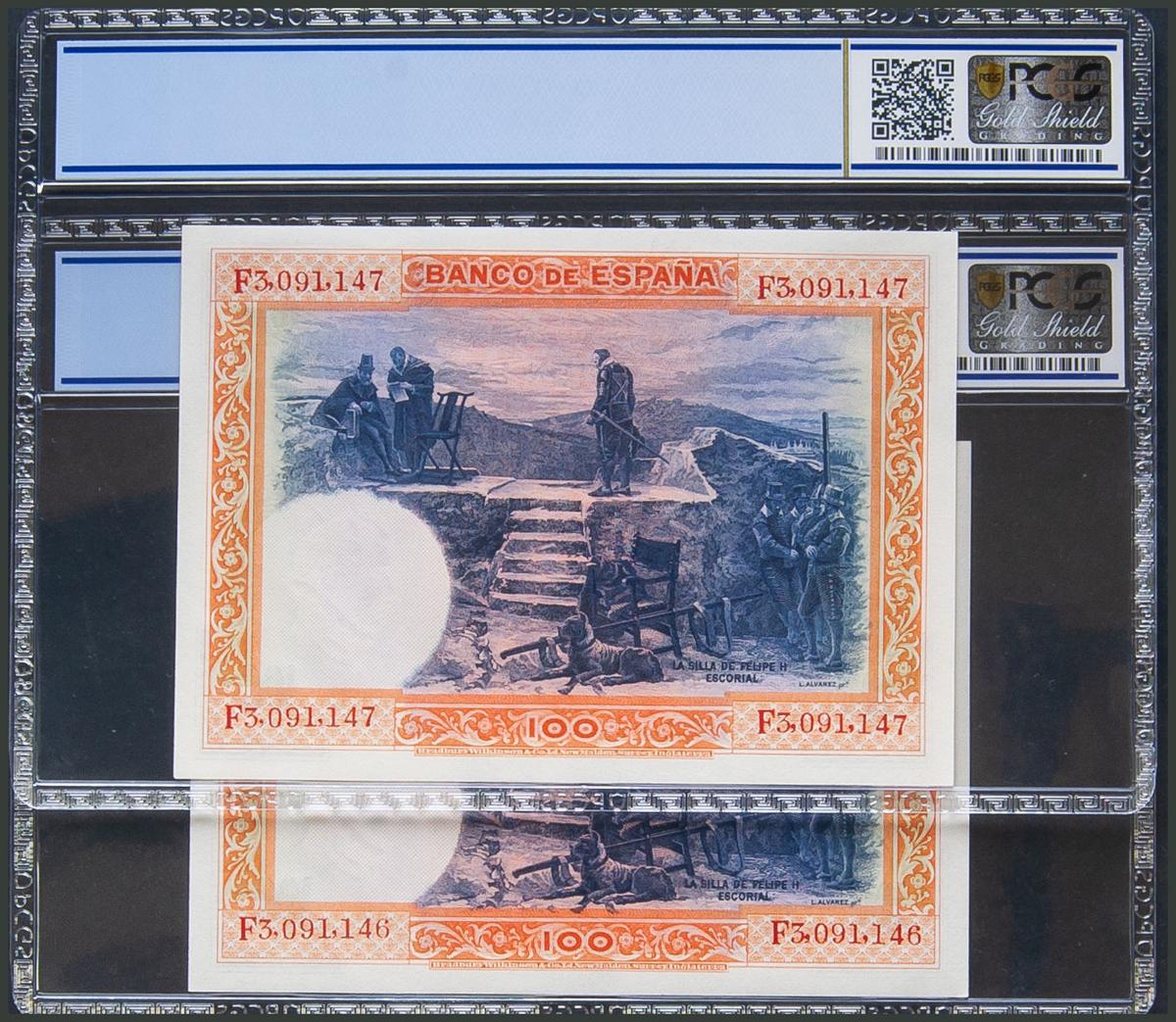 100 Pesetas. Pareja correlativa. Serie F. (Edifil 2017: 350). Apresto original. SC. Encapsulado PCGS66OPQ, ambos.