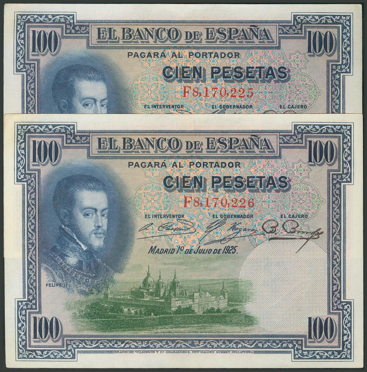 100 Pesetas. 1 de Julio de 1925. Pareja correlativa. Serie F. (Edifil 2017: 350). Apresto original. EBC+.