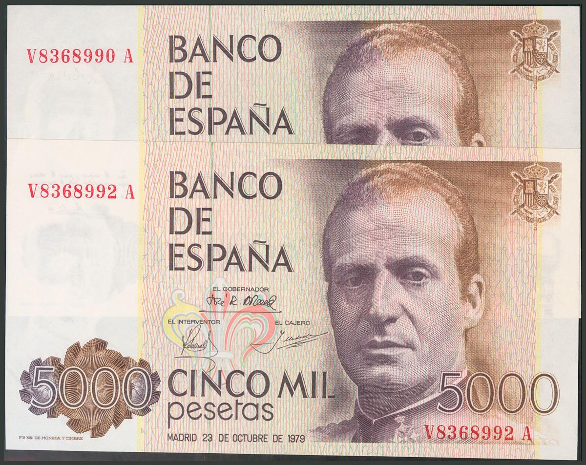 5000 Pesetas. 23 de Diciembre de 1979. Pareja correlativa. Serie V. (Edifil 2017: 478a). SC-.