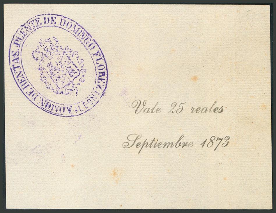 25 Reales. Septiembre de 1873. Vale de la Administración de Rentas de Puente de Domingo Flórez (León). (Edifil 2017: Página 26). Muy raro. EBC.