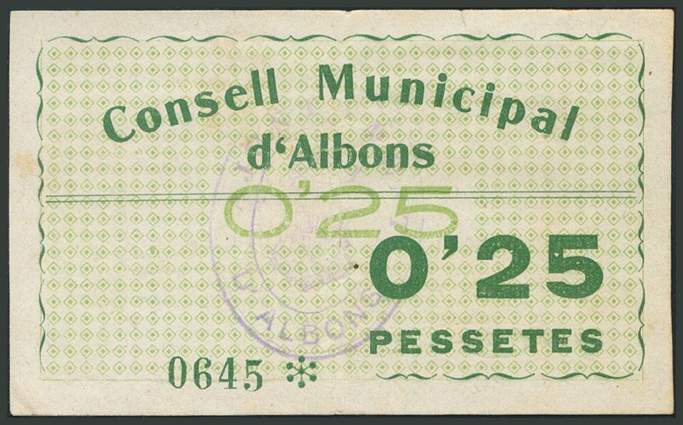 ALBONS (GERONA). 0´25 Pesetas. (1938ca). (González: 6126). MBC.