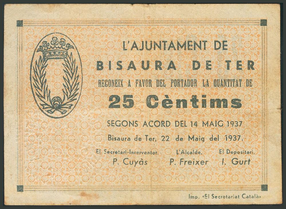 BISAURA DE TER (BARCELONA). 25 Céntimos. 22 de Junio de 1937. (González: 7058). MBC.