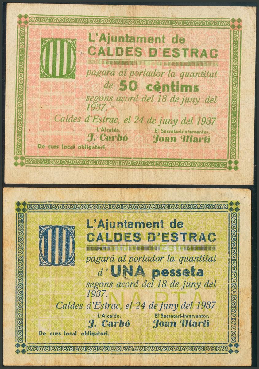CALDES D´ESTRAC (BARCELONA). 50 Céntimos y 1 Peseta. 24 de Junio de 1937. (González: 7274/75). BC.