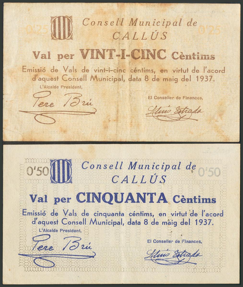 CALLUS (BARCELONA). 25 Céntimos y 50 Céntimos. 8 de Mayo de 1937. (González: 7297/98). BC/MBC.