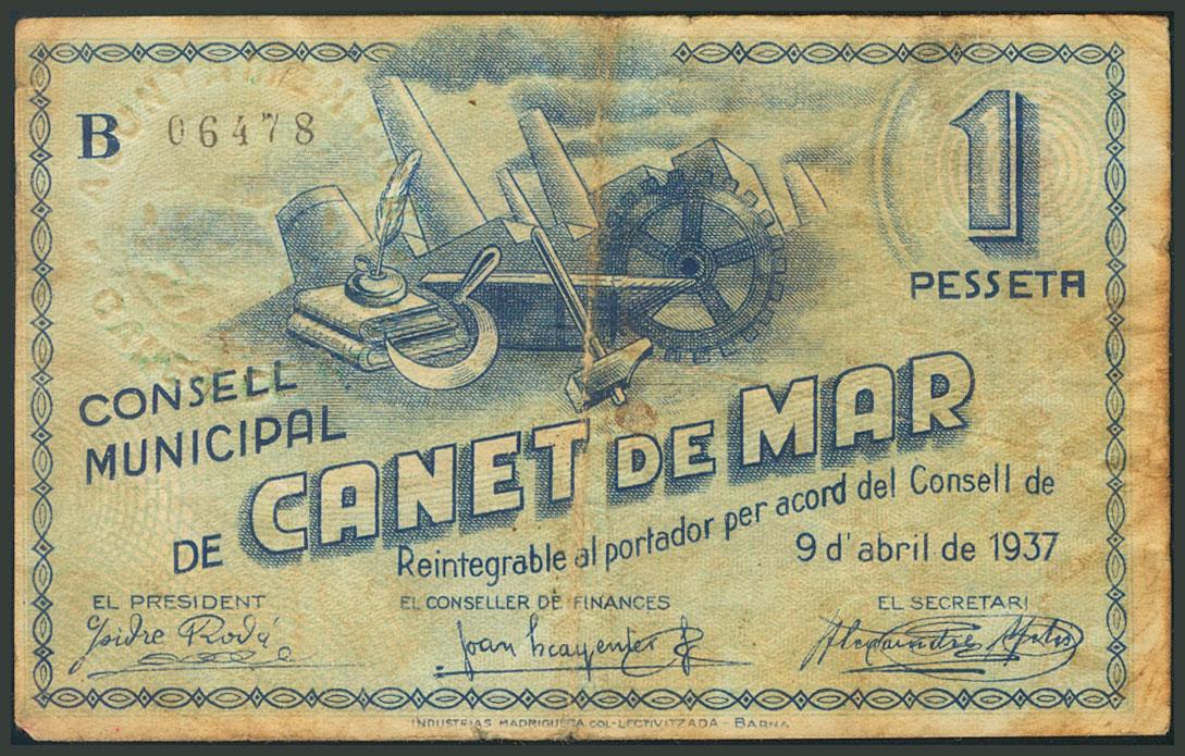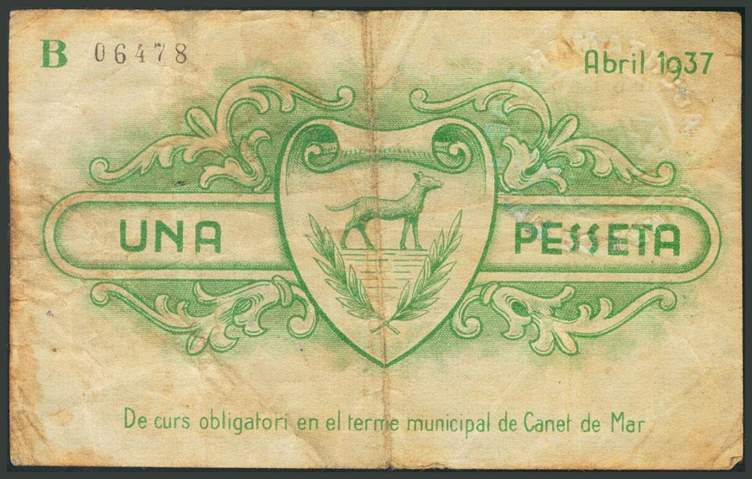 CANET DE MAR (BARCELONA). 1 Peseta. Abril 1937. Serie B. (González: 7343). BC.