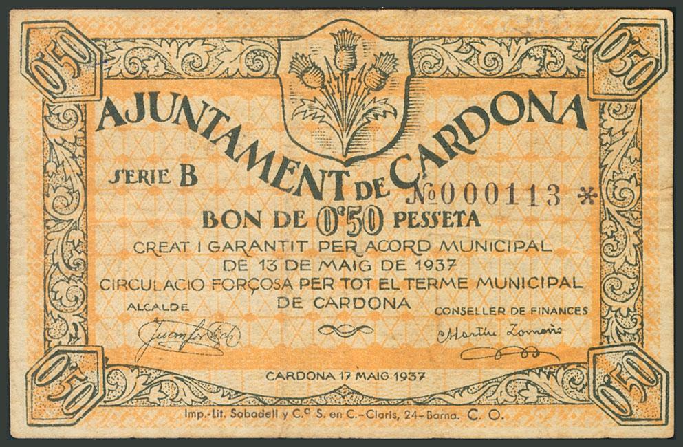 CARDONA (BARCELONA). 0´50 Pesetas. 17 de Mayo de 1937. Serie B. (González: 7392). BC.