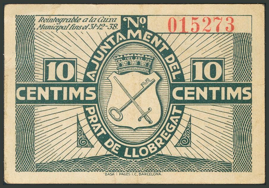 PRAT DE LLOBREGAT (BARCELONA). 10 Céntimos. 2 de Diciembre de 1937. (González: 9431). EBC.