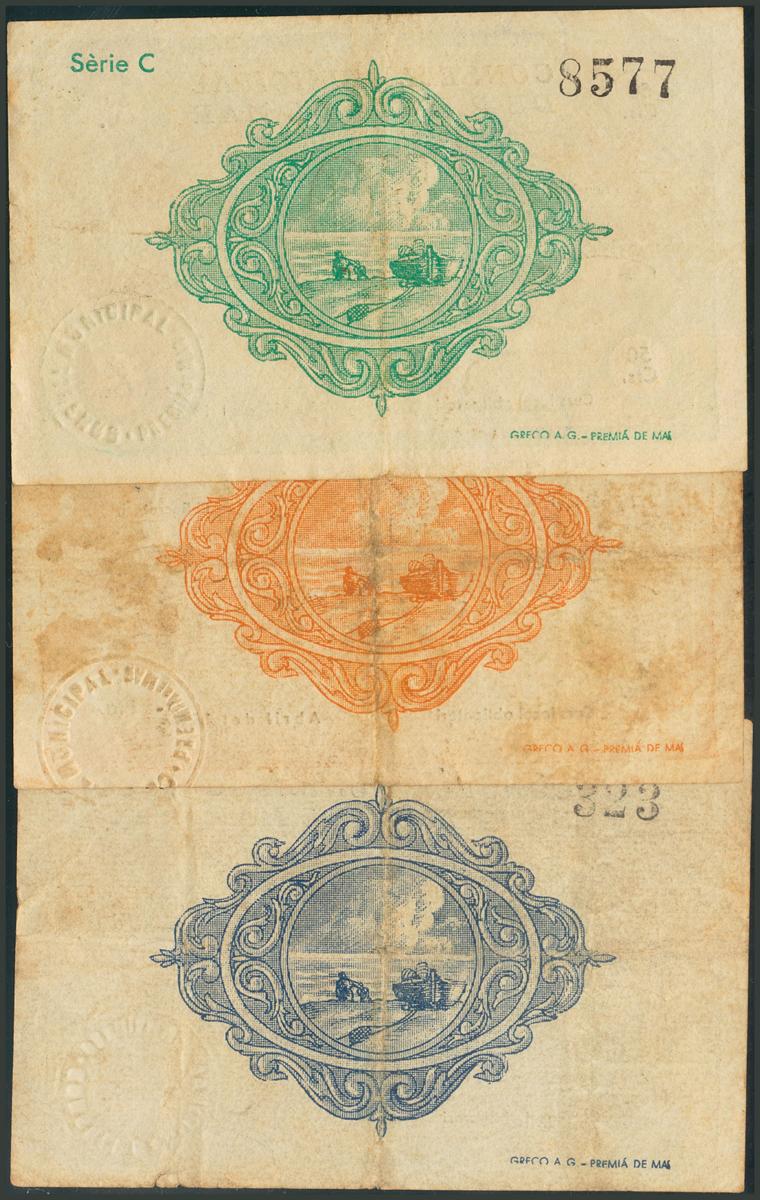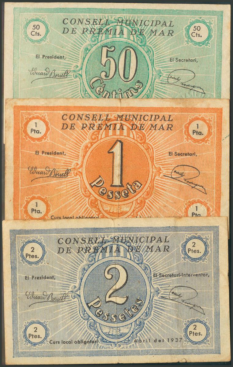 PREMIA DE MAR (BARCELONA). 50 Céntimos, 1 Peseta y 2 Pesetas. Abril 1937. Series C, B y A. (González: 9461/63). MBC.