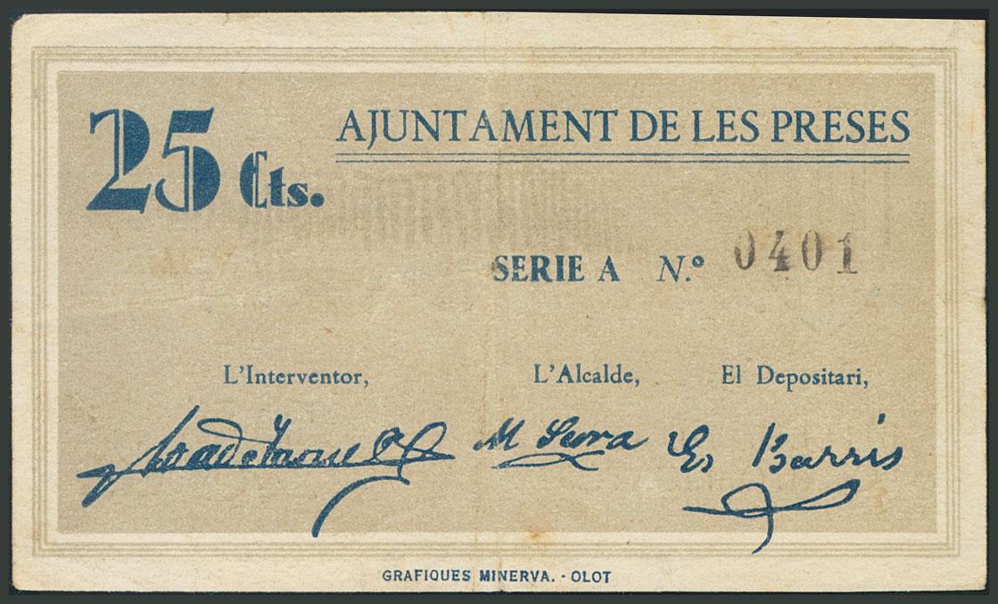 LES PRESES (GERONA). 25 Céntimos. 14 de Agosto de 1937. Serie A. (González: 9472). BC.