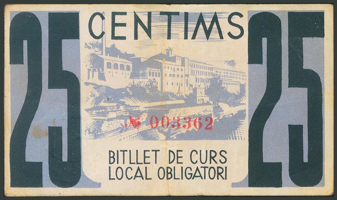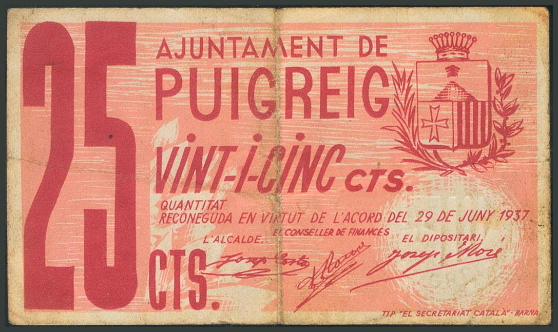 PUIGREIG (BARCELONA). 25 Céntimos. 29 de Junio de 1937. (González: 9501). BC.