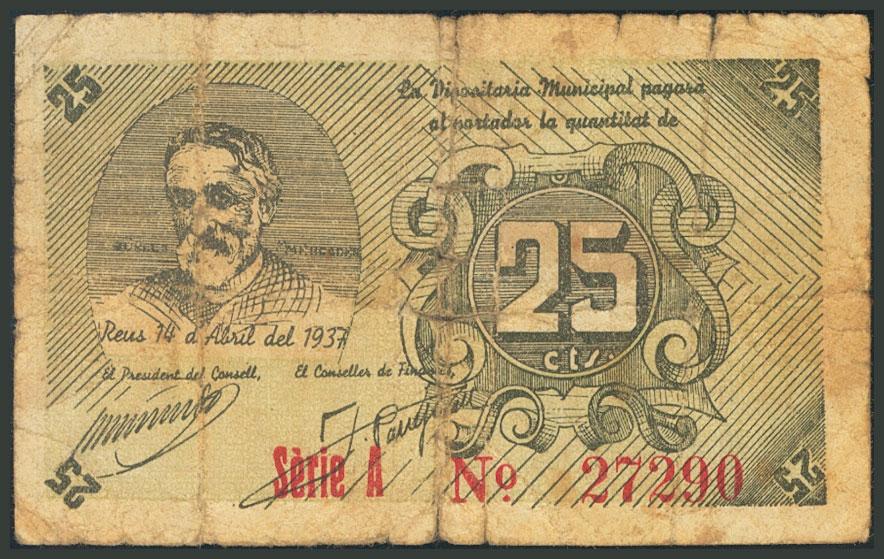 REUS (TARRAGONA). 25 Céntimos. 14 de Abril de 1937. Serie A. (González: 9548). BC.
