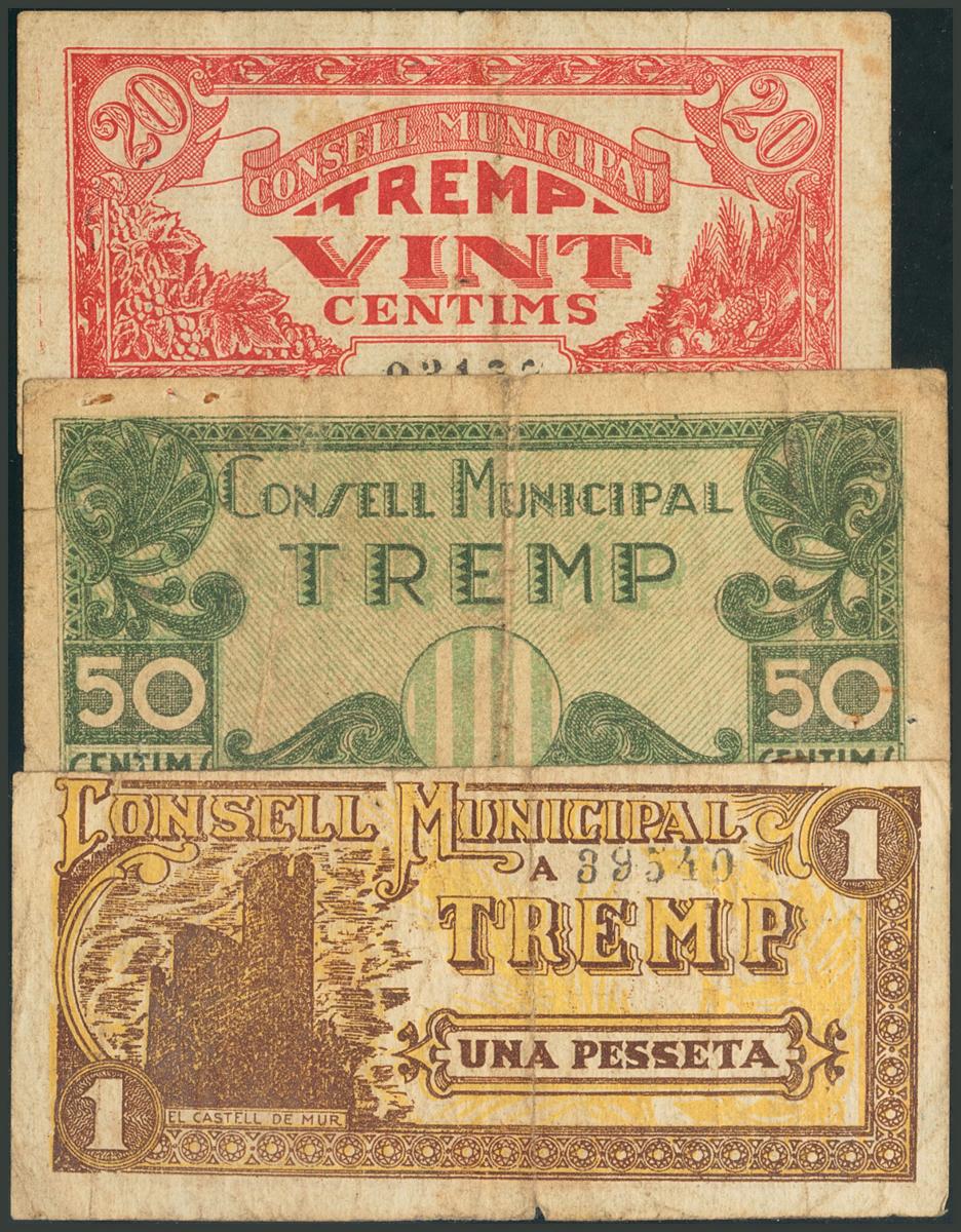 TREMP (LERIDA). 20 Céntimos, 50 Céntimos y 1 Peseta (variante marrón y amarillo). (1937ca). Serie A. (González: 10439/40, 1043). BC.
